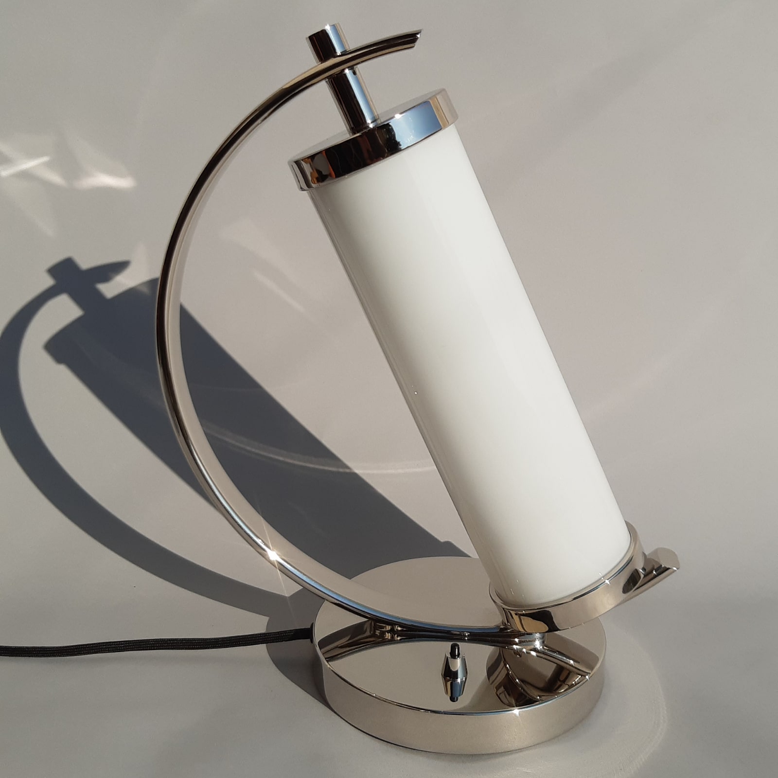 Der Opalglas-Tubus dieser Tischlampe im Art-decó Stil wird von einer halbrunden Halterung getragen.