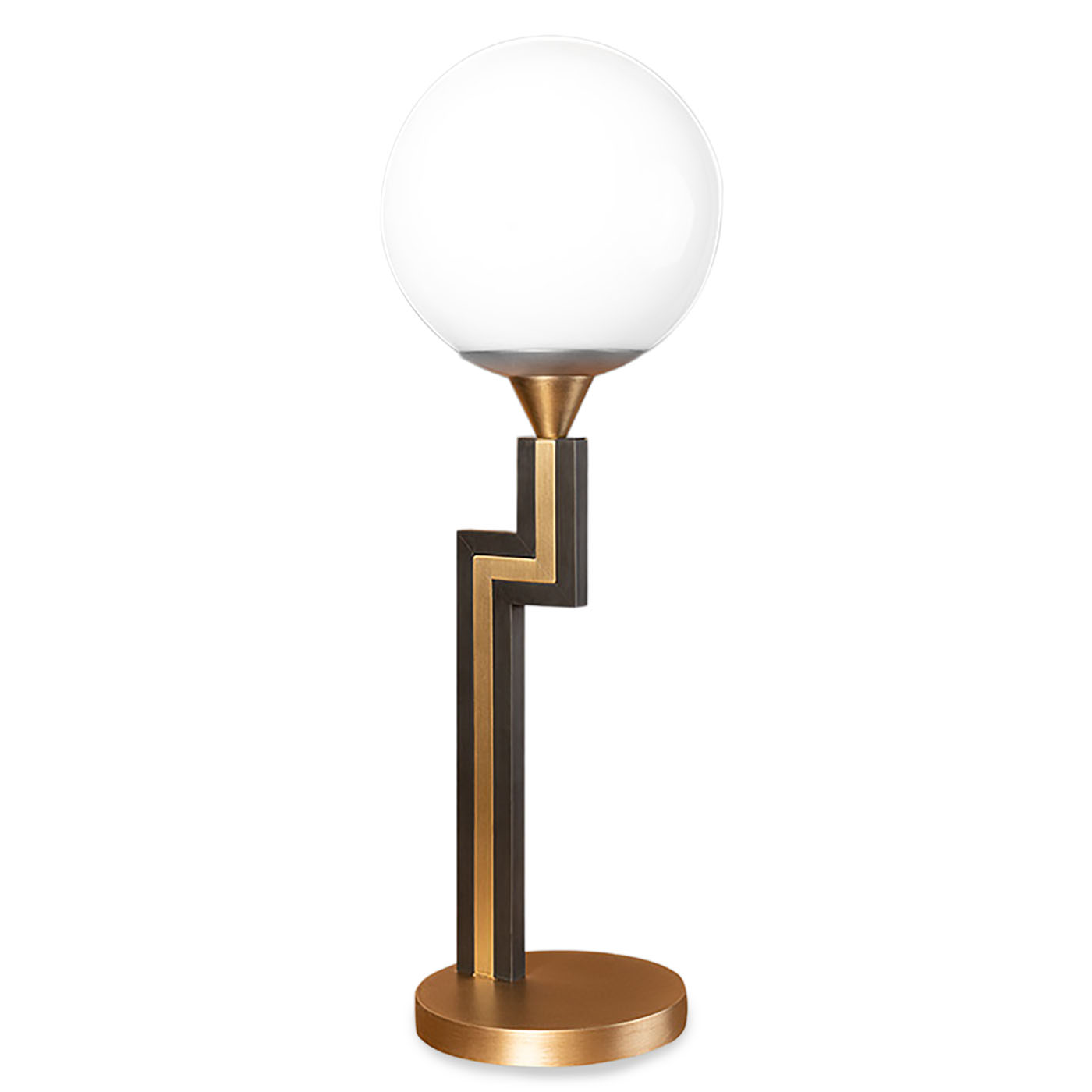 Diese markante Kugel-Tischleuchte aus der „Odyssey“-Serie entwarf die Designerin Linda Bayon. Sie besteht aus drei Messing-Vierkantrohren in Schwarz und mattem Gold, die mit ihren Winkeln eine Art „Lichtblitz“ erzeugen.
