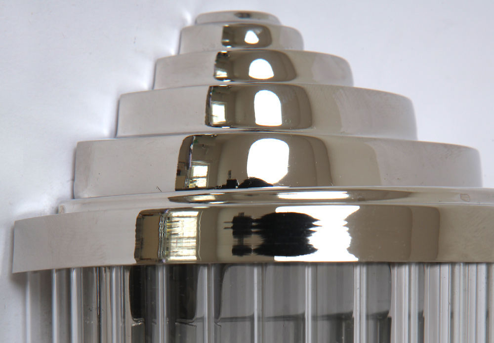 Diese handgefertigte Replik einer typischen Art Déco Stab-Wandleuchte eignet sich z.B. für Flure, Lobbies und Treppenaufgänge. Der Korpus besteht aus Messing (in verschiedenen Oberflächen erhältlich) mit eingelegten, filigranen Kristall-Glasstäbchen.