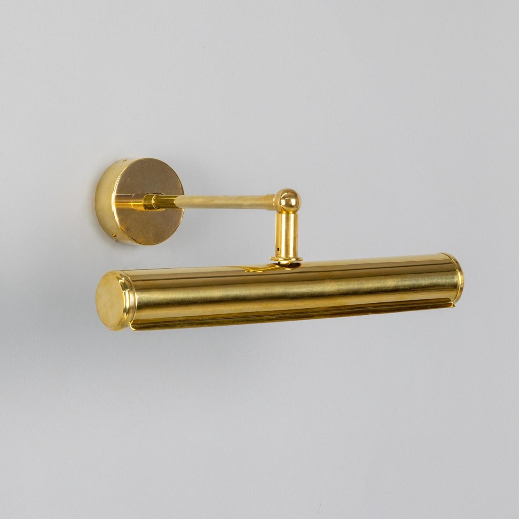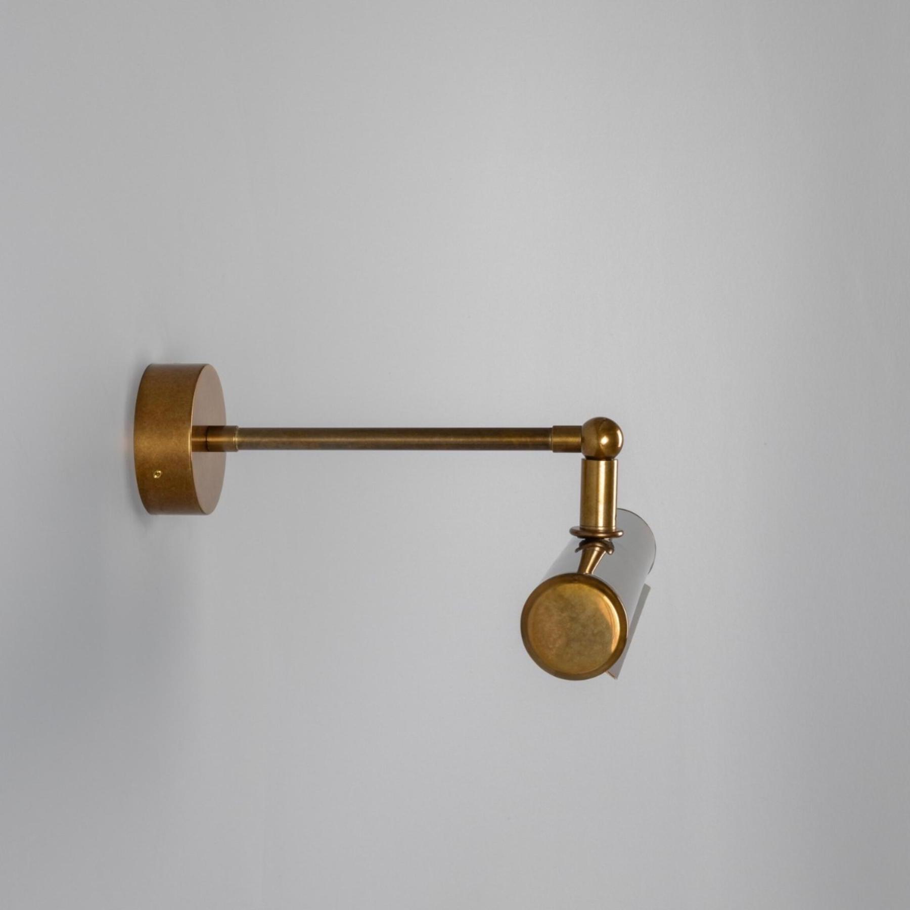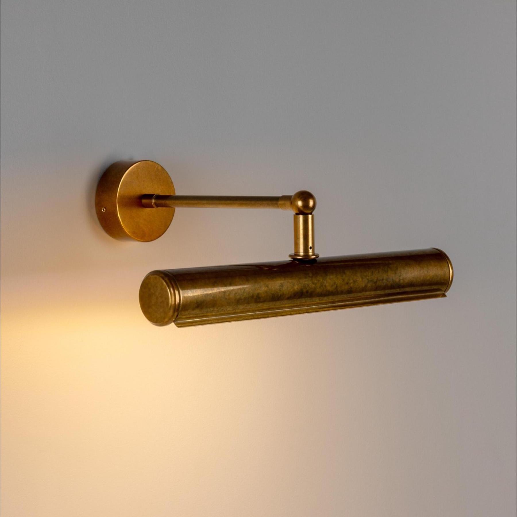 Diese Wandleuchte wurde speziell für Badezimmer entwickelt. Durch die Kombination eines feststehenden Messingarms mit einem 35,5 cm langen Schirm wirft die Leuchte ein gleichmäßiges Licht, ideal für die Montage über dem Badezimmer-Spiegel.