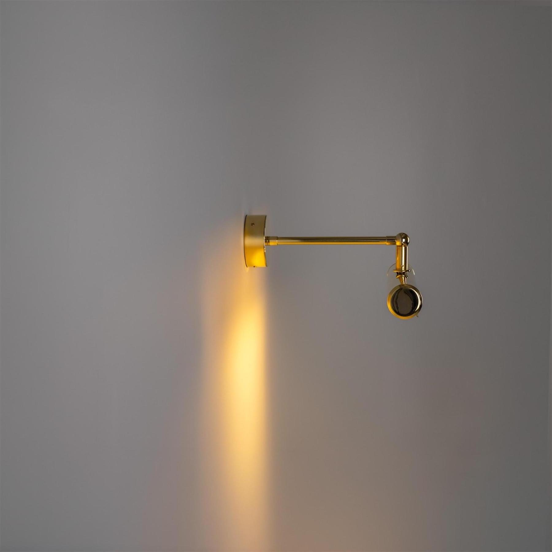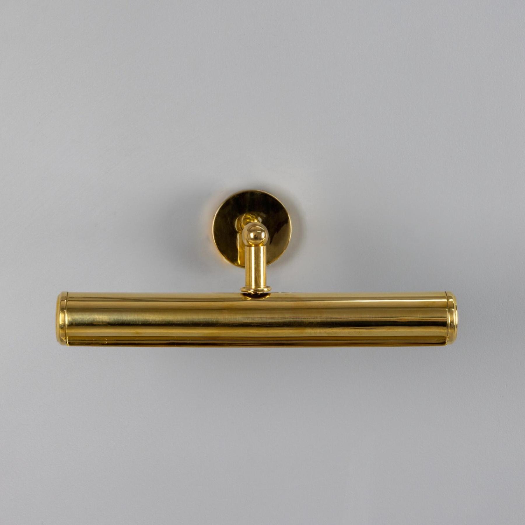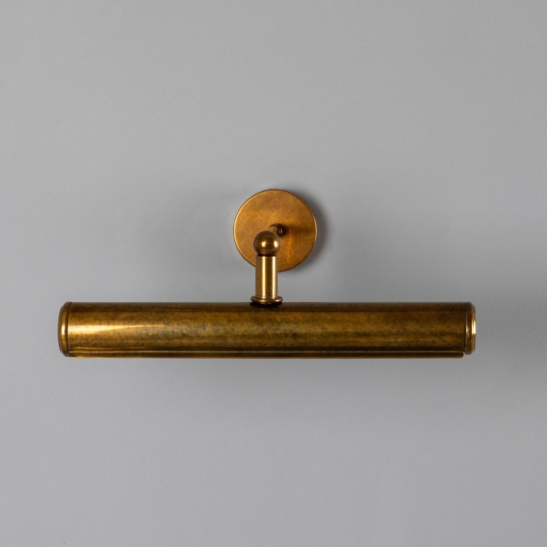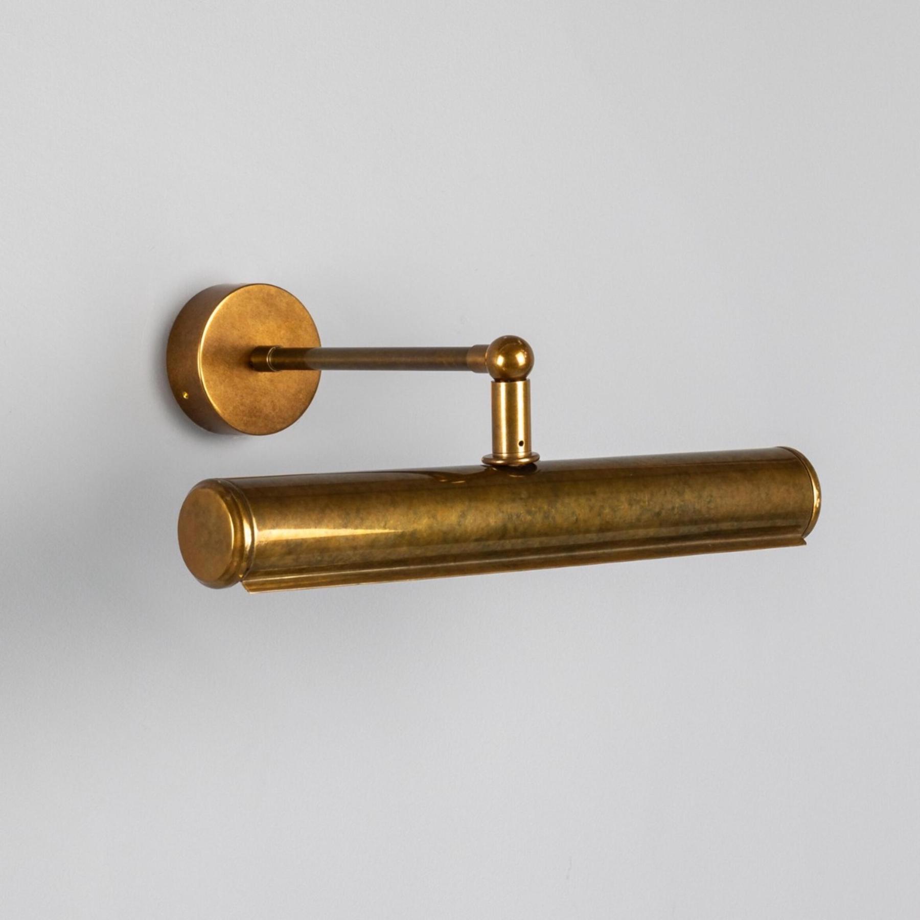 Diese Wandleuchte wurde speziell für Badezimmer entwickelt. Durch die Kombination eines feststehenden Messingarms mit einem 35,5 cm langen Schirm wirft die Leuchte ein gleichmäßiges Licht, ideal für die Montage über dem Badezimmer-Spiegel.