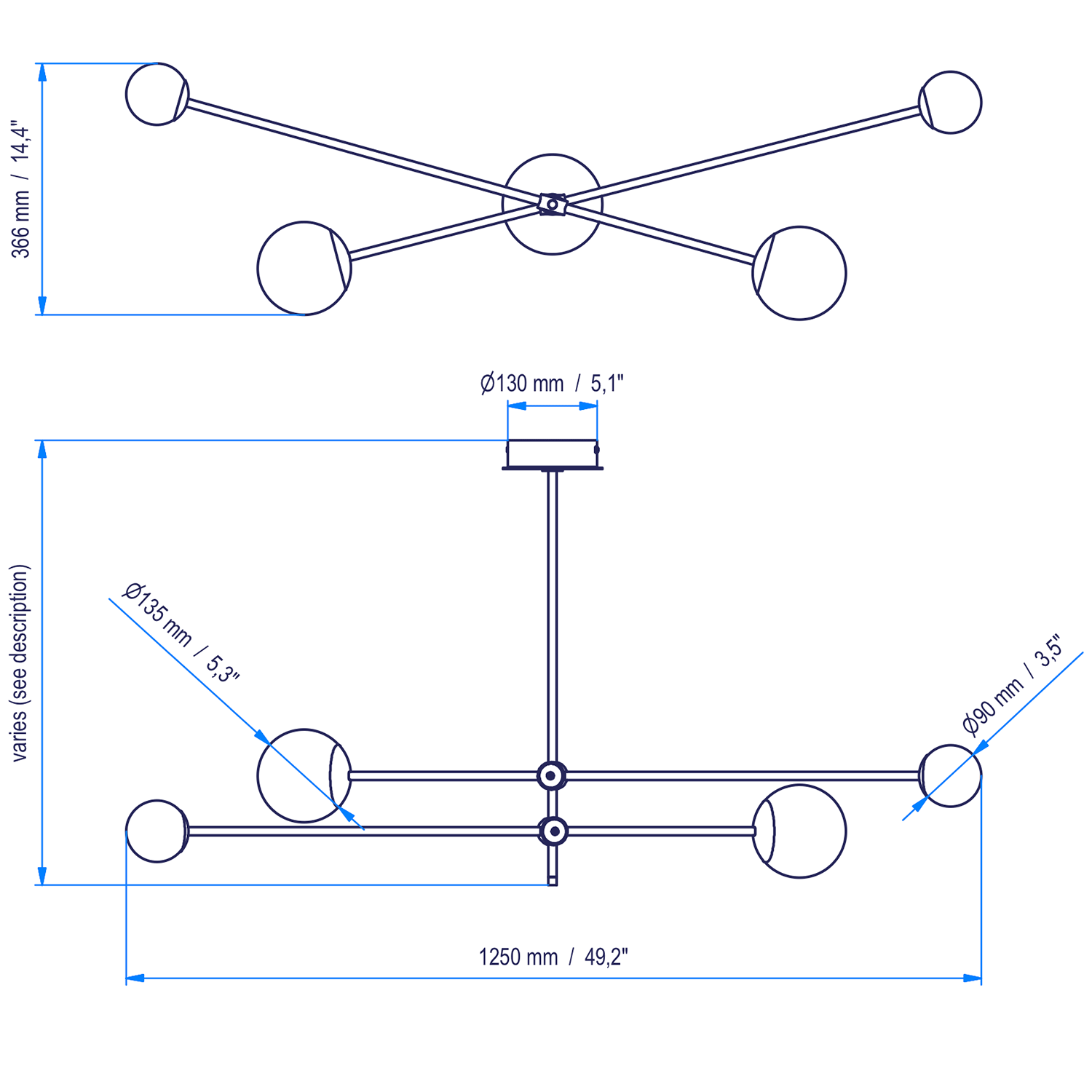 Die minimalistische Kugel-Deckenleuchte gibt es mit Gestängen in acht Standard-Gesamthöhen von ca. 35 cm (Modell 1) bis 140 cm (Modell 8) – andere Maße sind auf Anfrage möglich.