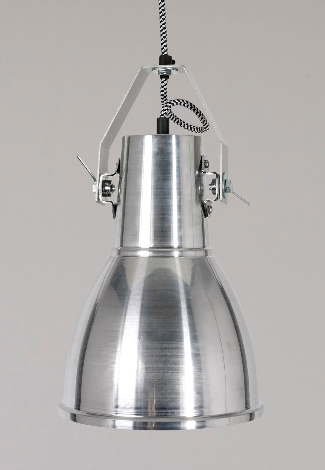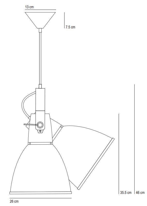 Der Schirm dieser Fabrik-Hängelampe aus England wird aus Aluminiumblech gedrückt. Er ist in einem Bügel eingehängt und ist mittels Schrauben in der Neigung einstellbar.