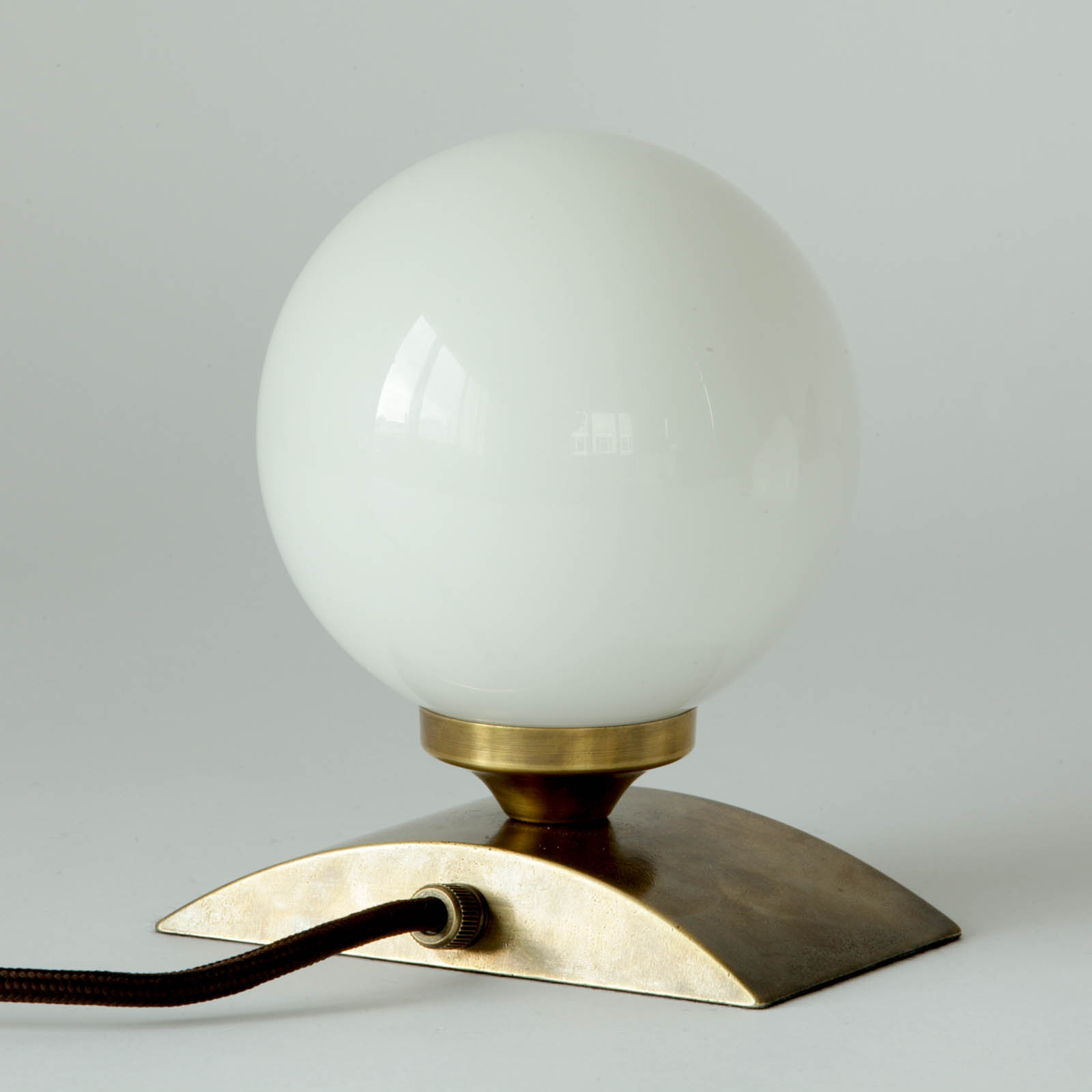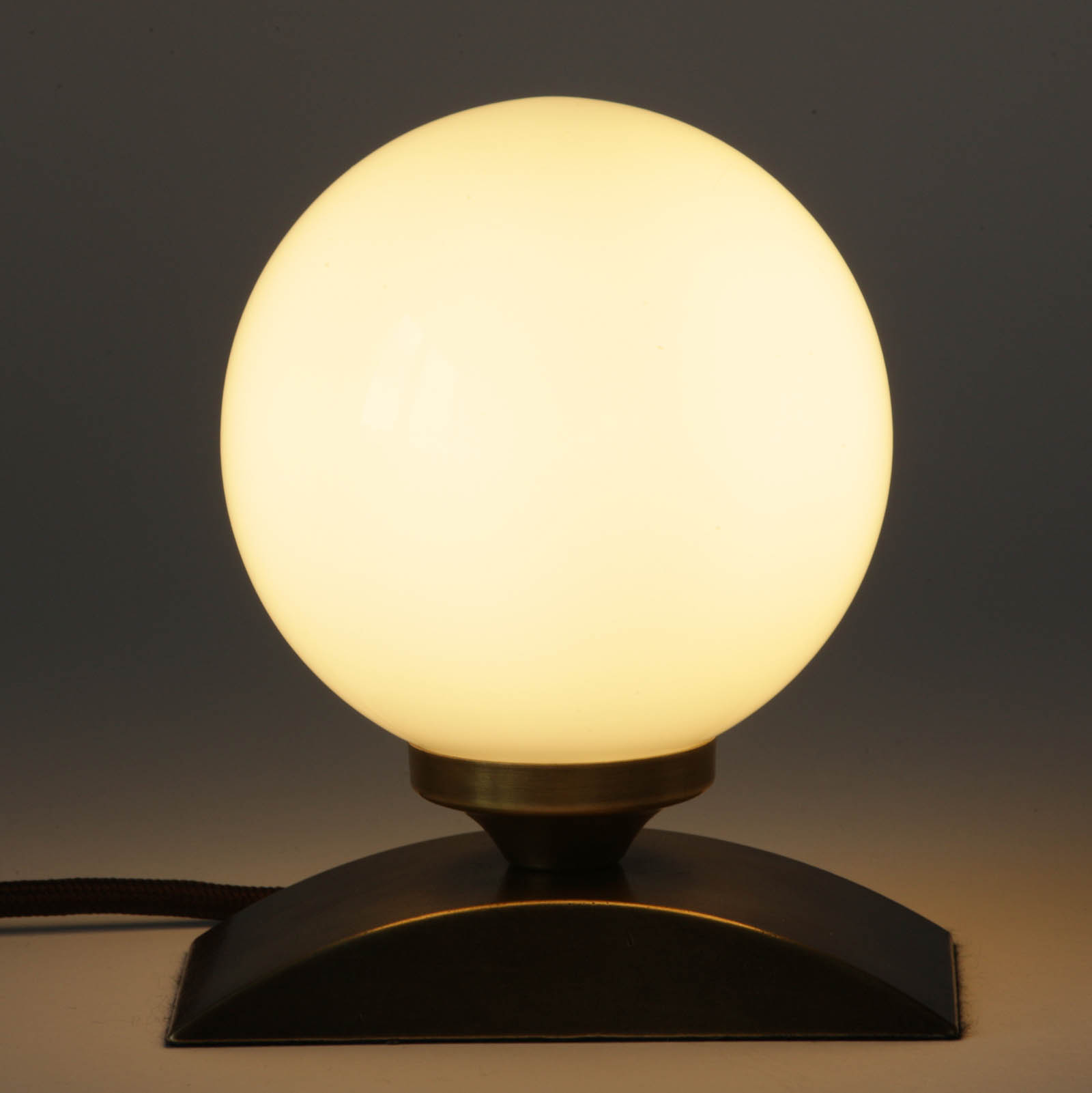 Diese Tischlampe sorgt mit einer 12 cm kleinen Glaskugel aus mundgeblasenem Opalglas für stimmungsvoll sanftes Licht. Zusammen mit dem schweren Standfuß aus Messing erinnert diese Kugel-Tischleuchte an die eleganten Art Déco-Interieurs der 20er und 30er Jahre.