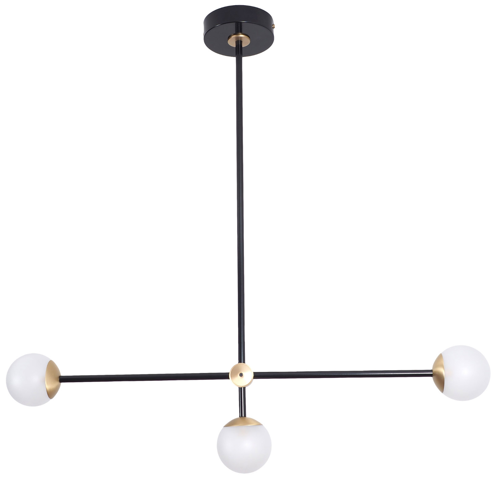 Dieser elegante, zeitlos-moderne Design-Hängeleuchter in umgekehrter T-Form trägt drei kleine Glaskugeln (Ø 9 oder 13,5 cm) aus matt satiniertem Glas an einem Gestänge aus Messing.