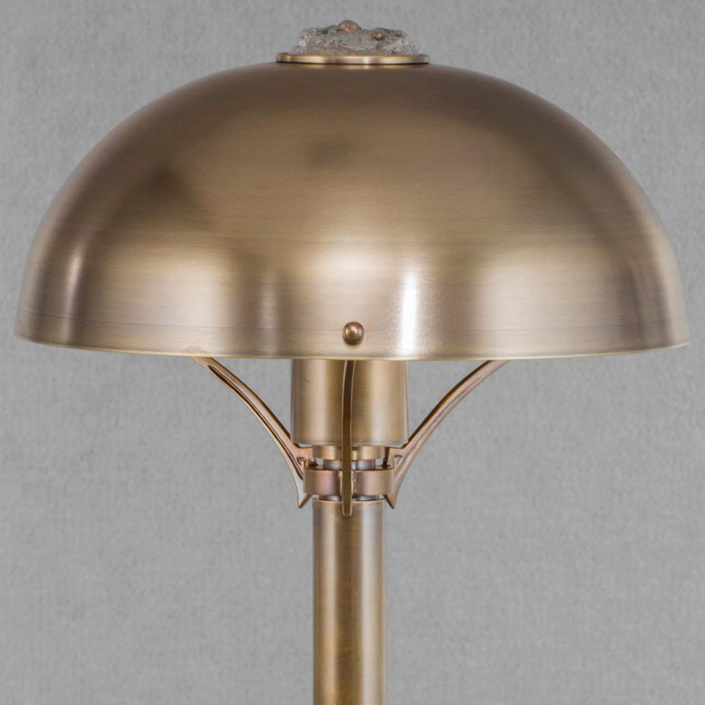 Handgefertigte Replik einer extravaganten Art déco-Tischleuchte aus Messing. Mit Pilz-Schirm aus Messing, oben verziert mit einem Kristall-Einsatz, der ein faszinierendes Lichtspiel bewirkt.