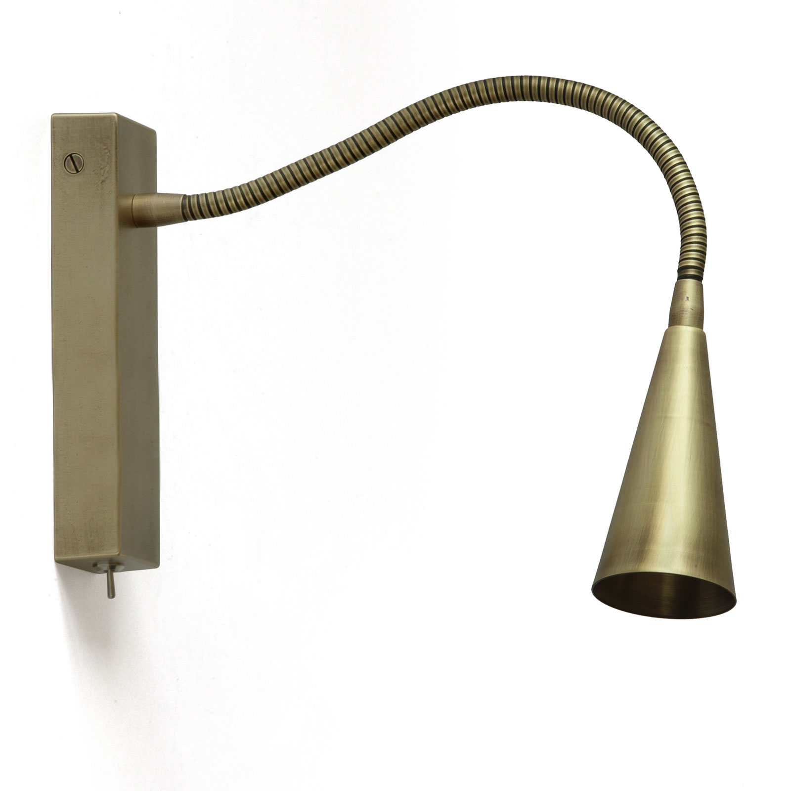 Diese schlichte Wandleuchte mit schmalem Kegelschirm ist aus Messing gefertigt und eignet sich ideal als Bettleuchte.