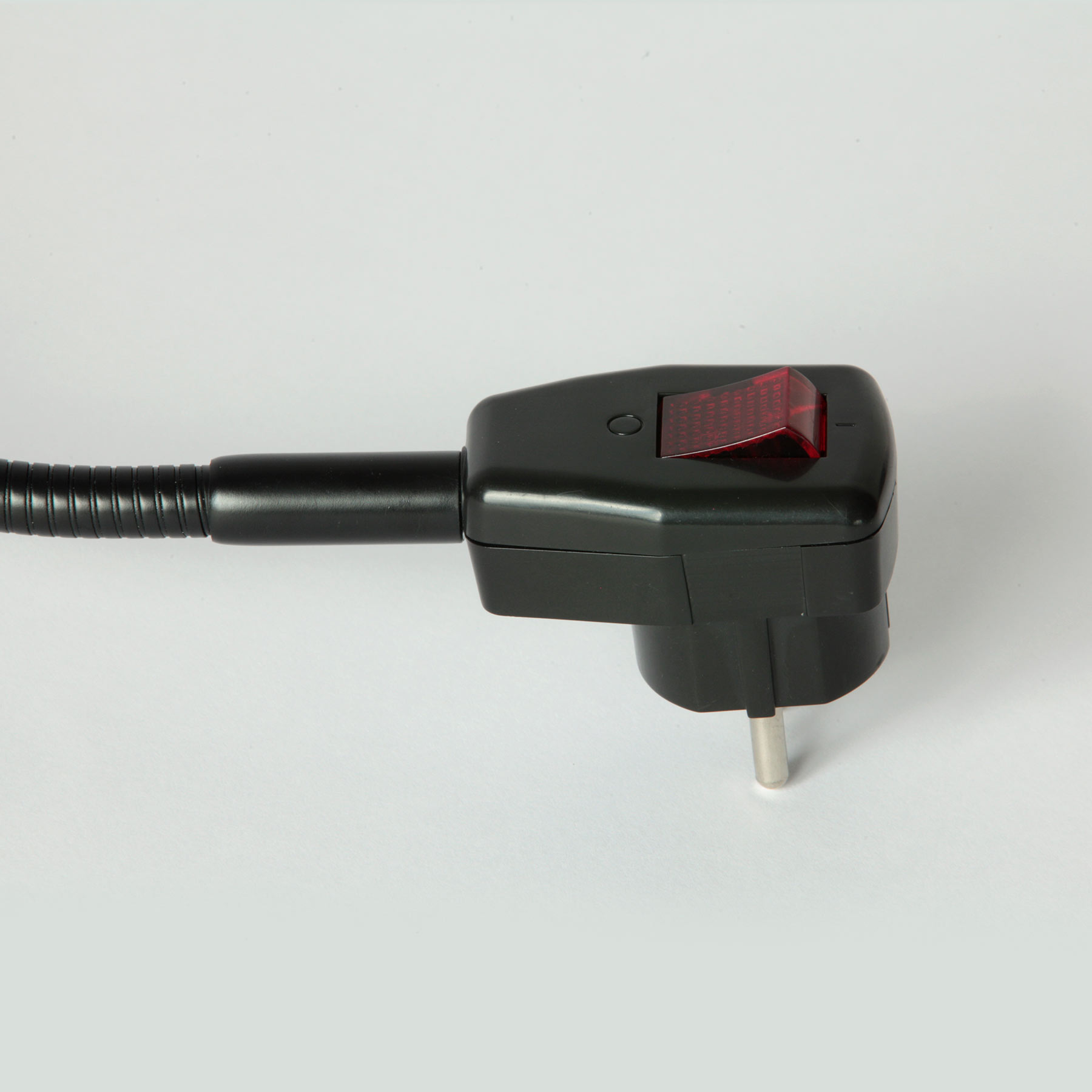 Der Schuko-Winkelstecker ist mit einem rot-transparenten Wippschalter ausgestattet.