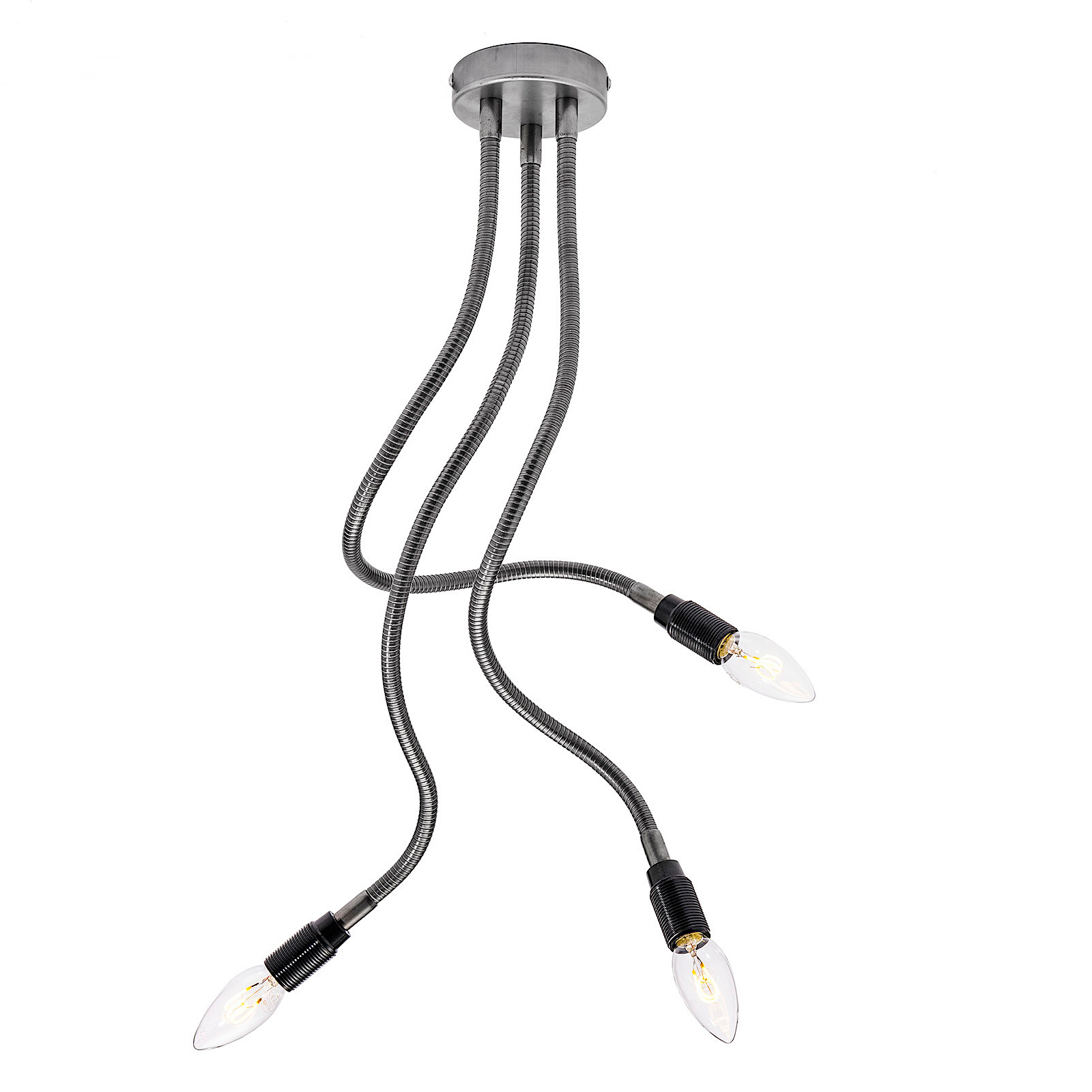 Die drei 60 cm langen Arme sind jeweils mit einer E14-Bakelitfassungbestückt und lassen sich sich flexibel biegen und und frei ausrichten.