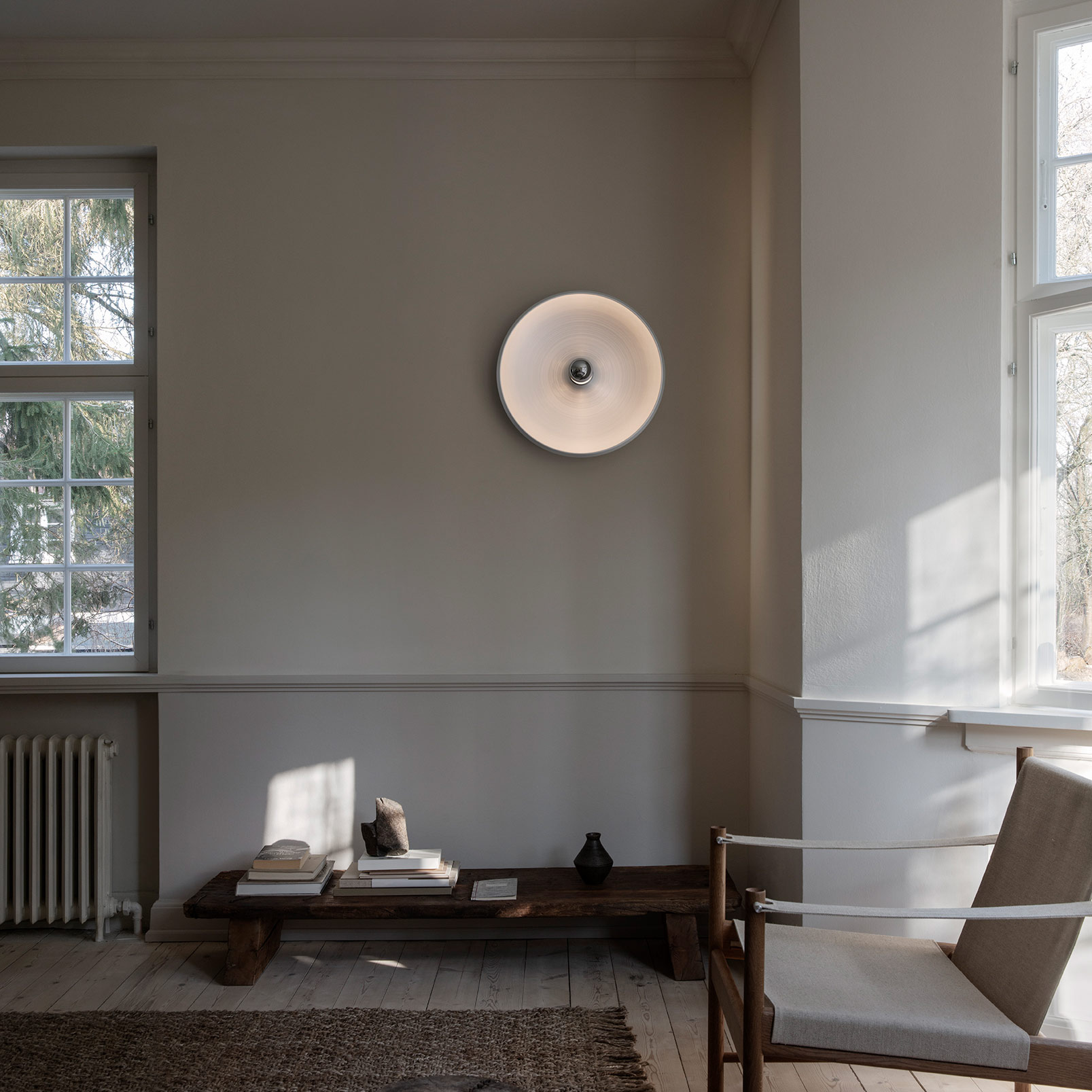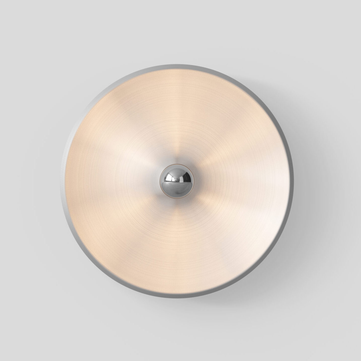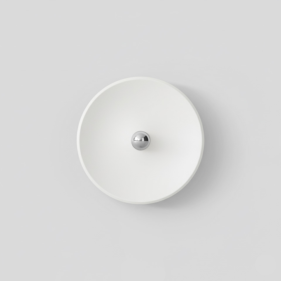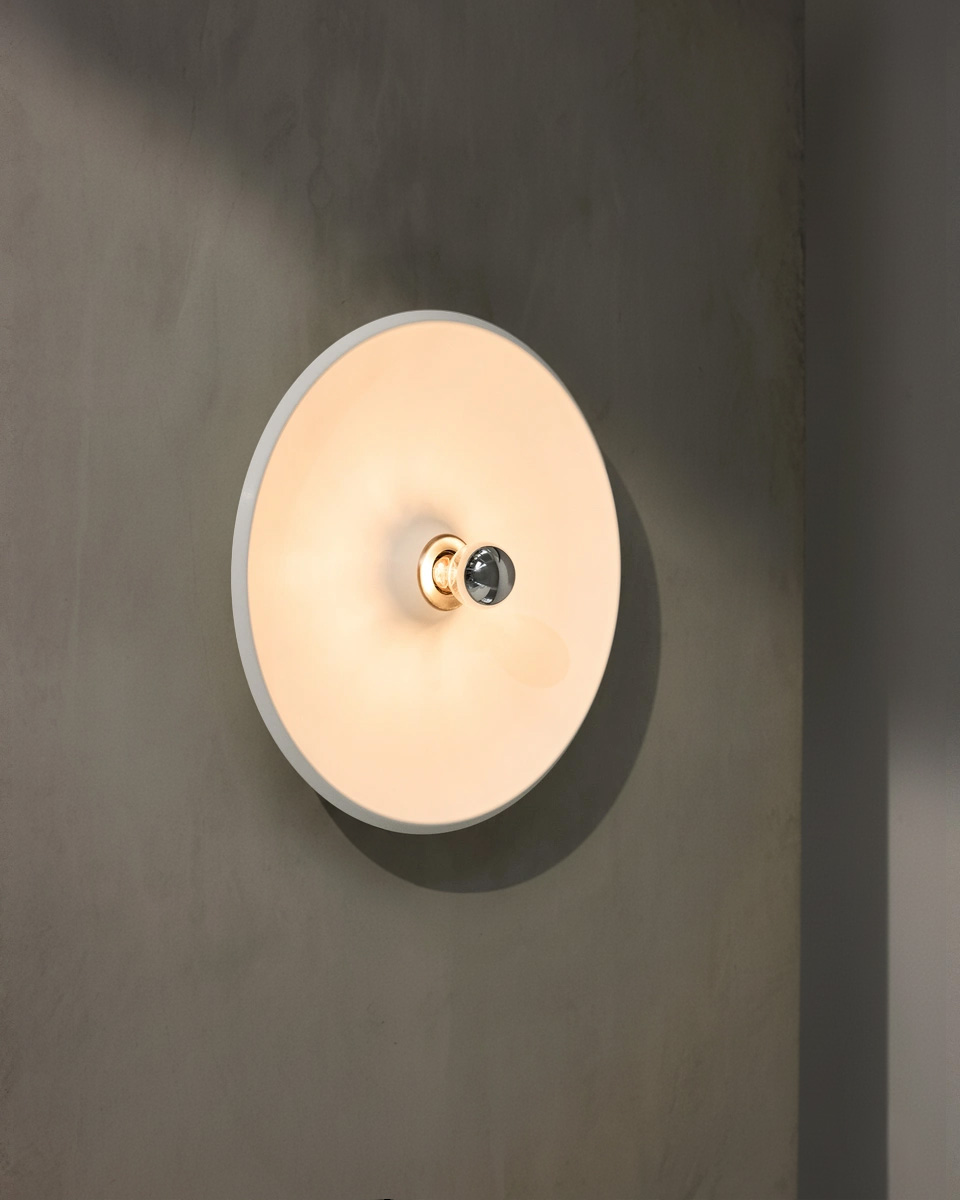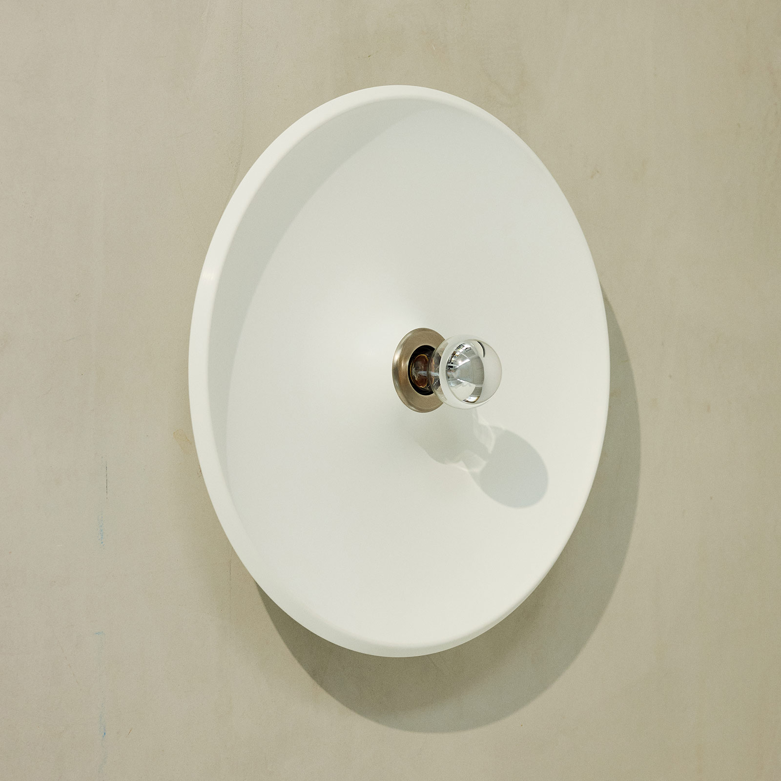Diese Scheiben-Wandleuchte wurde von 1971 von Gino Sarfatti für Arteluce entworfen. Im Mittelpunkt dieses Mid Century- bzw. Space Age-Designklassikers steht die kopfverspiegelte Glühbirne; der runde Teller-Reflektor streut sanftes, konsequent indirektes Licht.