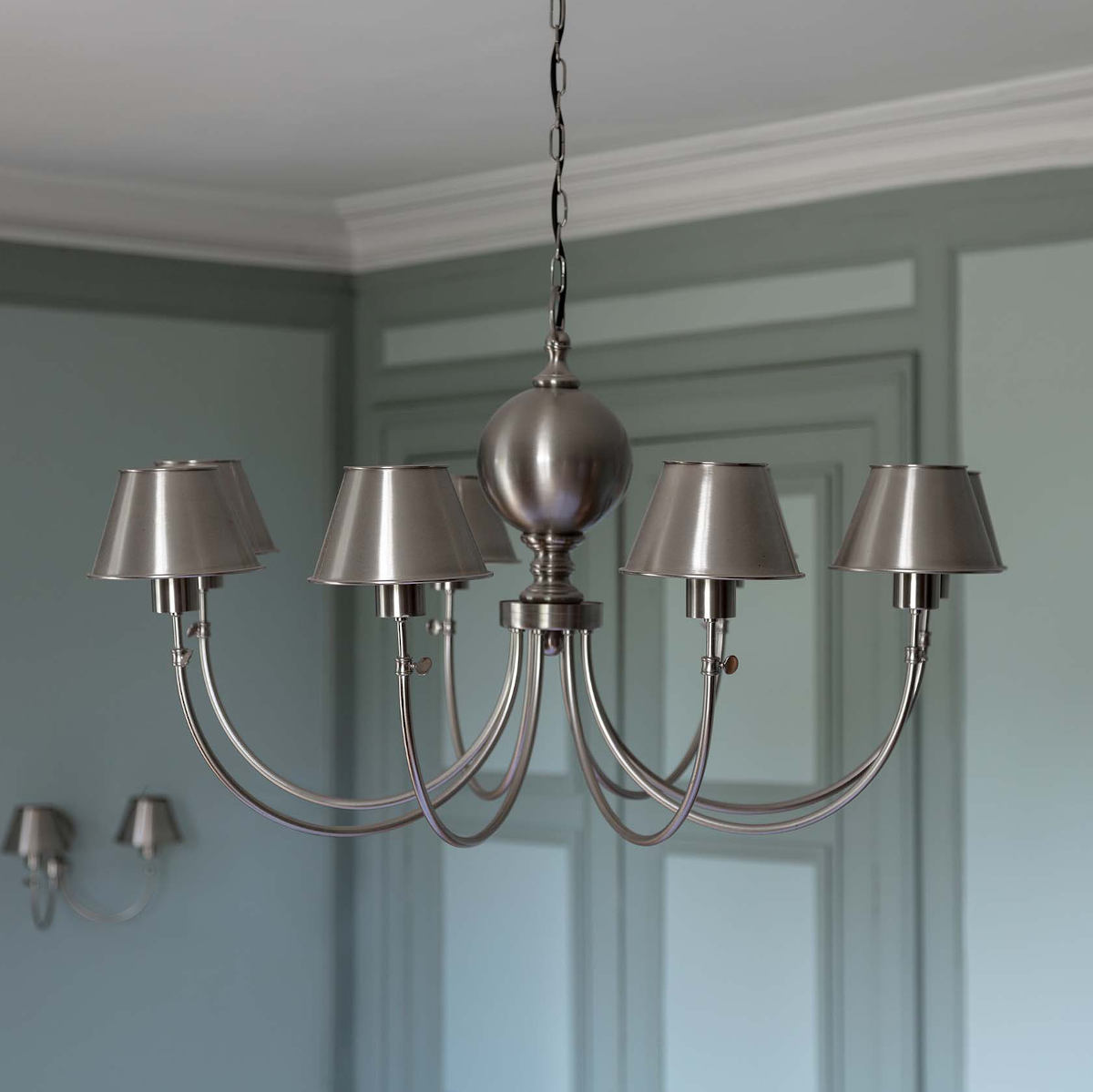 Dieser große achtflammige französische Manufaktur-Leuchter mit kleinen Metallschirmen ist in verschiedenen Oberflächenausführungen erhältlich (siehe Bild 2). Inklusive Kette und Baldachin.
