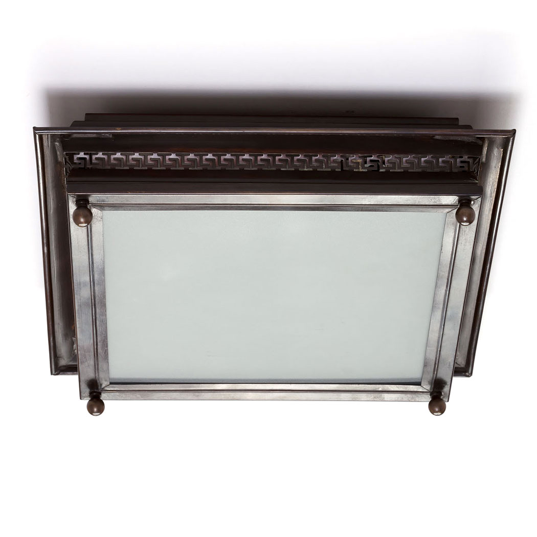 Diese quadratische Kasten-Deckenleuchte wird in der französischen Manufaktur aus Messing oder Kupfer von Hand gefertigt. Zur gleichmäßigen Ausleuchtung werden LED-Streifen mit 3000 K verwendet.