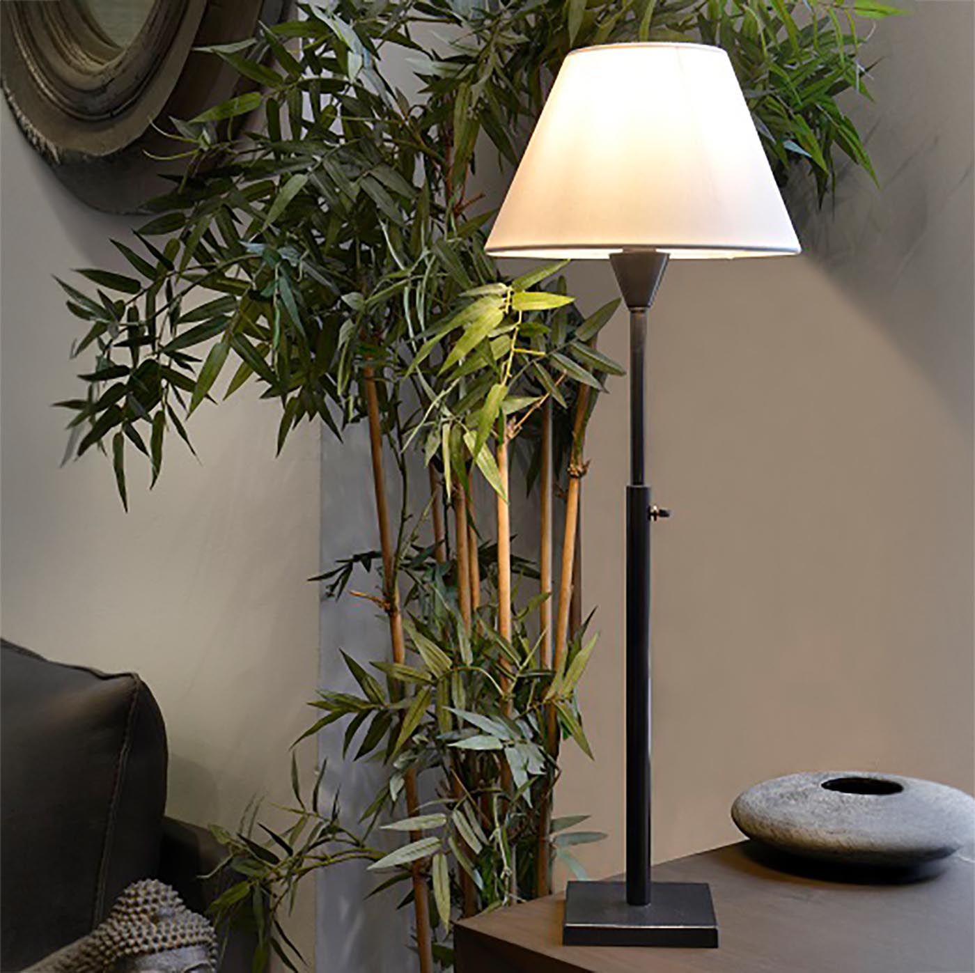 Eine zeitloses, klassisches Design aus Frankreich: diese grazile, hohe Tischleuchte überzeugt mit einem teleskopisch höhenverstellbaren Fuß aus Messing und einem stilvollen kleinen Textilschirm.