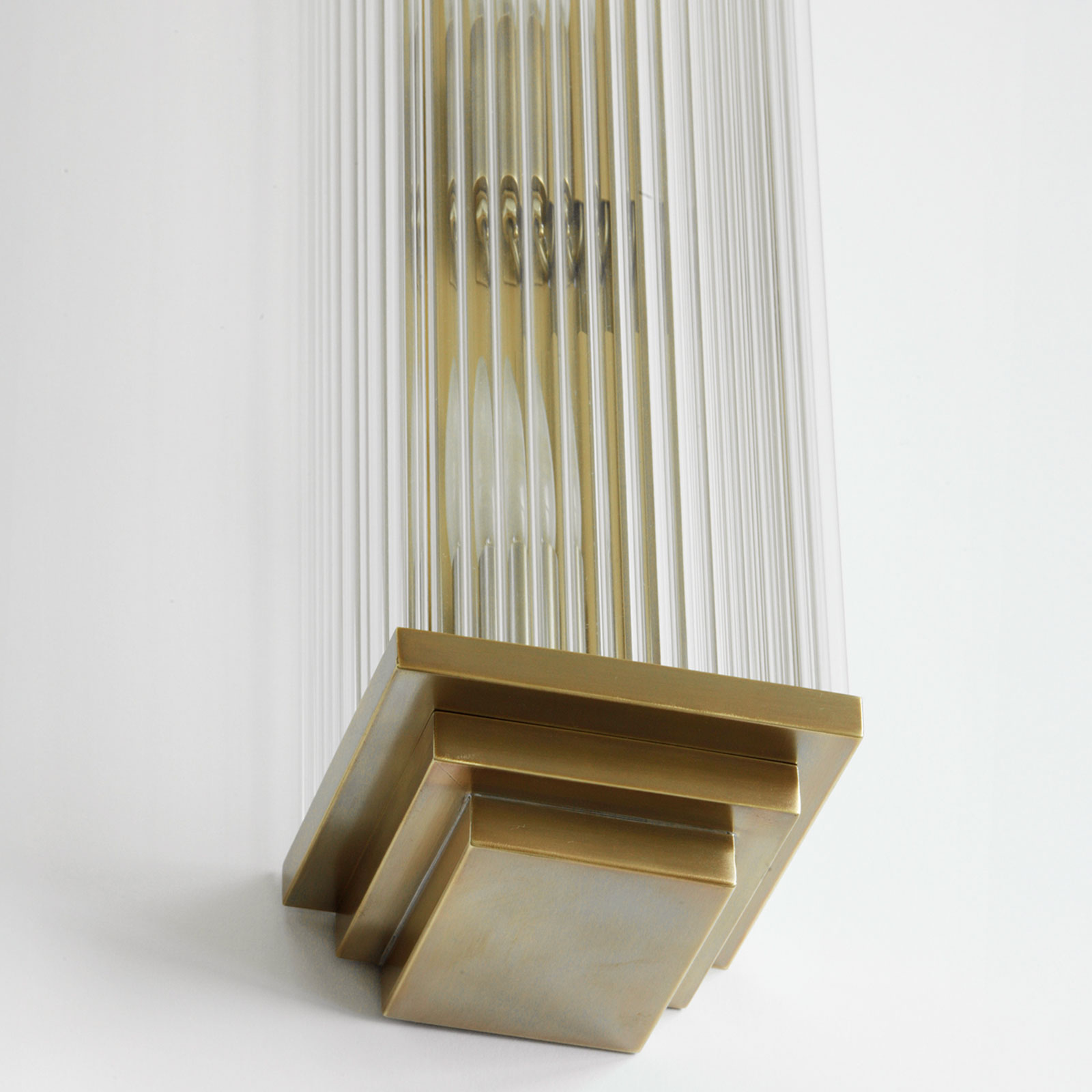 Diese exklusive, 46 cm oder 70 cm hohe handgefertigte Kristallglas-Wandleuchte in eleganter Art Déco-Formensprache eignet sich z.B. für Lobbies, Salons und repäsentative Treppenaufgänge.