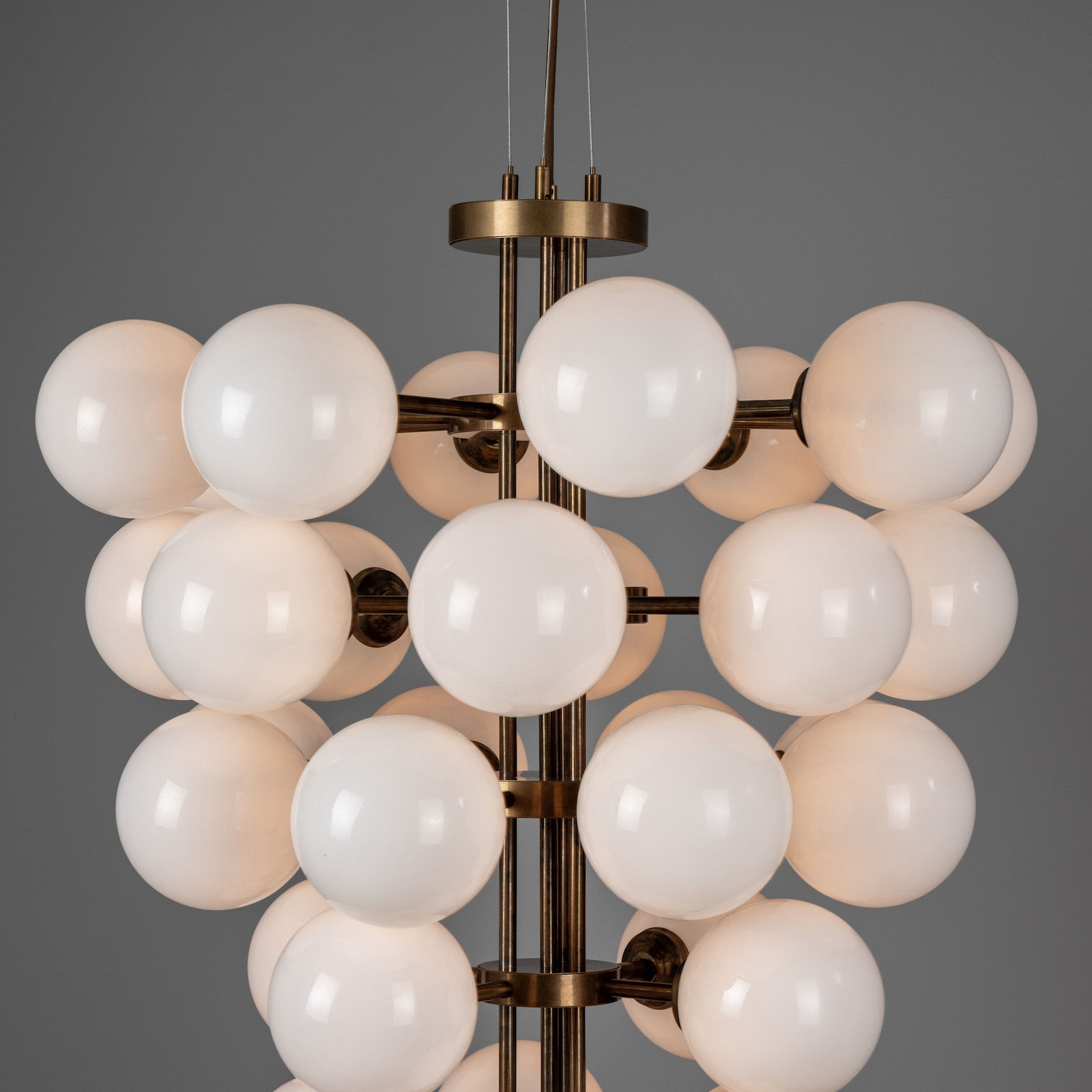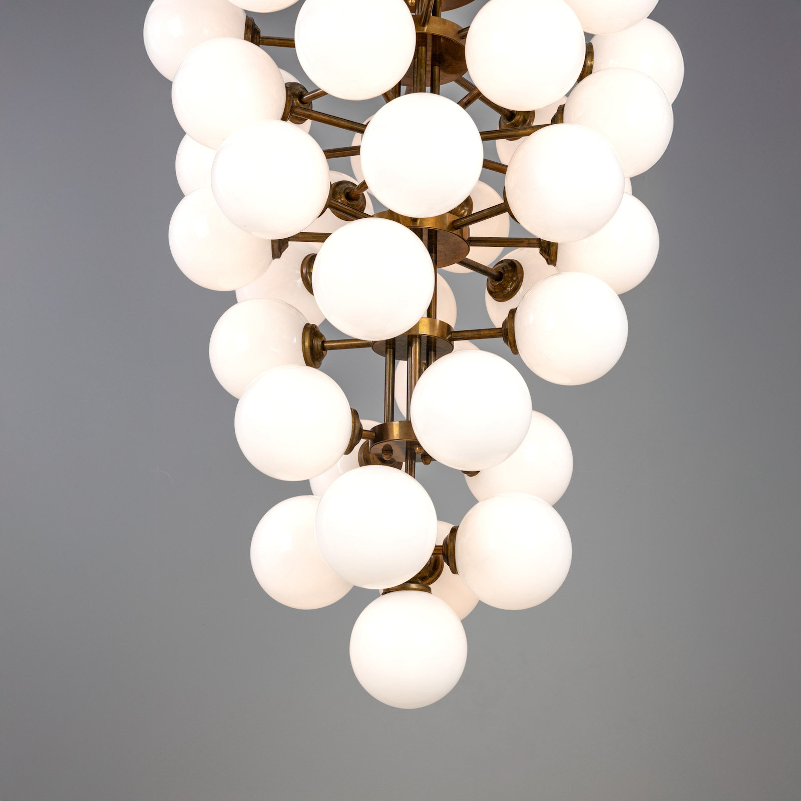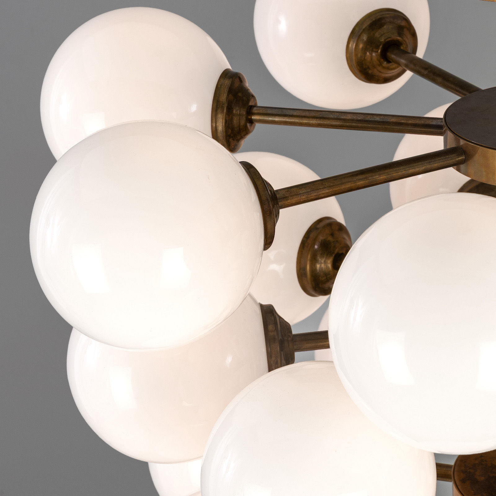 Der beeindruckender Kronleuchter trägt eine Traube aus 37 opalen Glaskugel-Schirmen an einem zentralen Messinggestell.