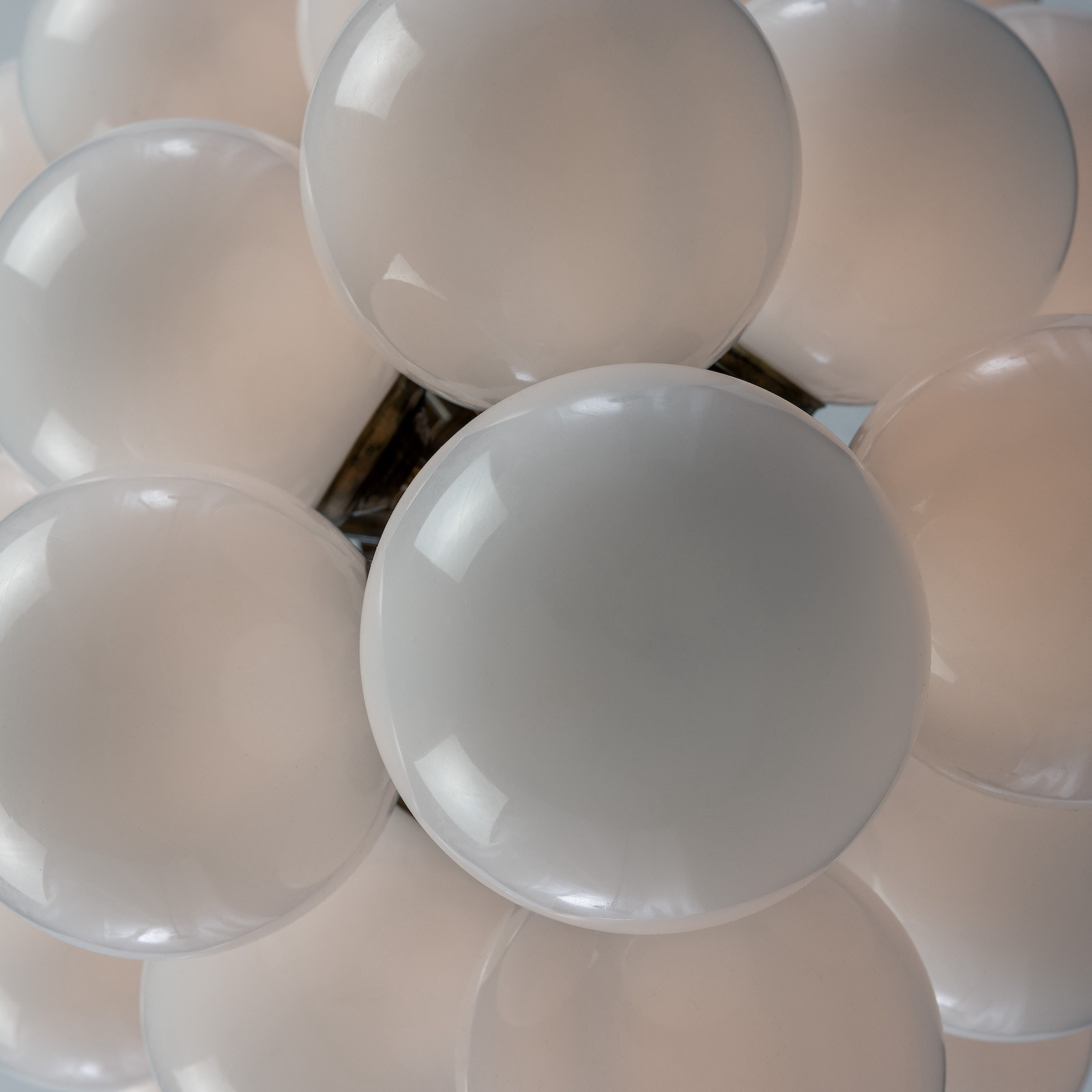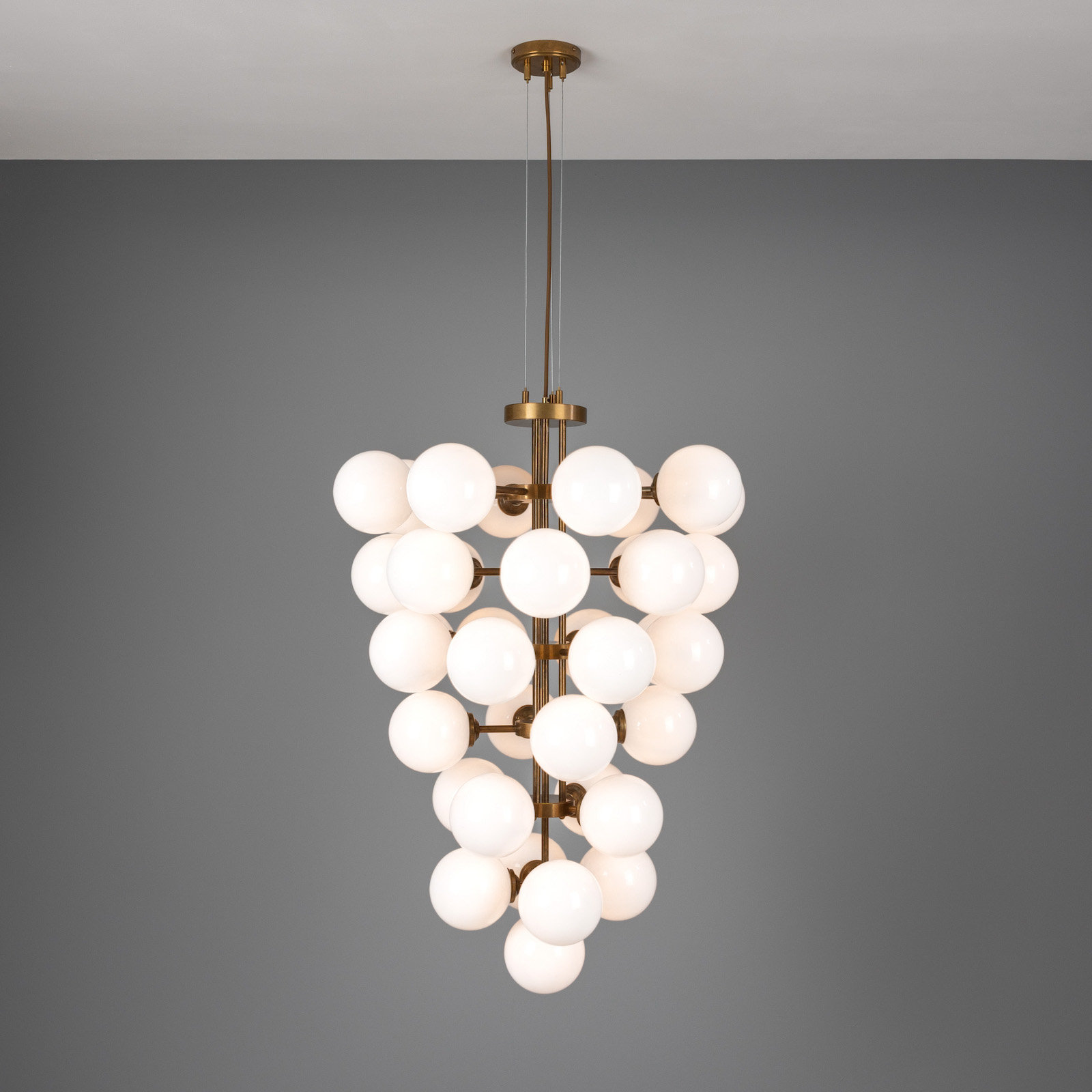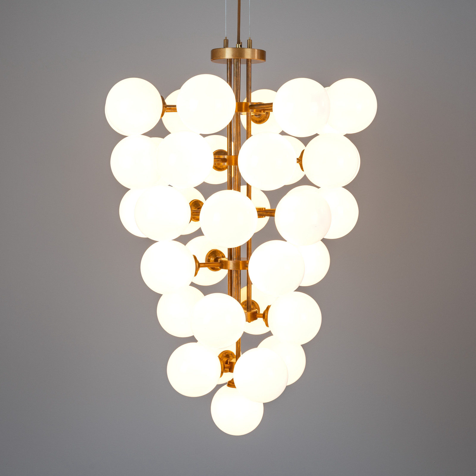 Der beeindruckender Kronleuchter trägt eine Traube aus 37 opalen Glaskugel-Schirmen an einem zentralen Messinggestell.