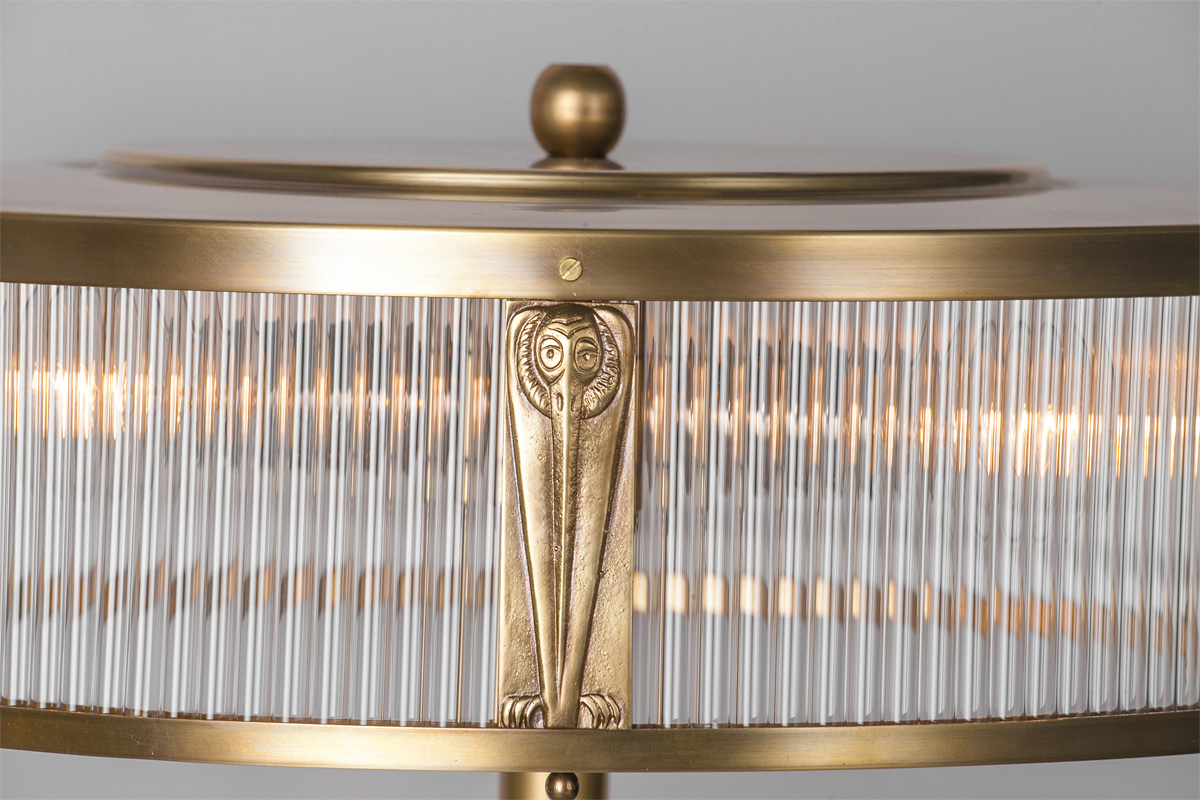 Bodenplatte, Standfuß und die Schirmaufhängung sind aus reinem Messing gefertigt und in verschiedenen Oberflächen ausführbar.