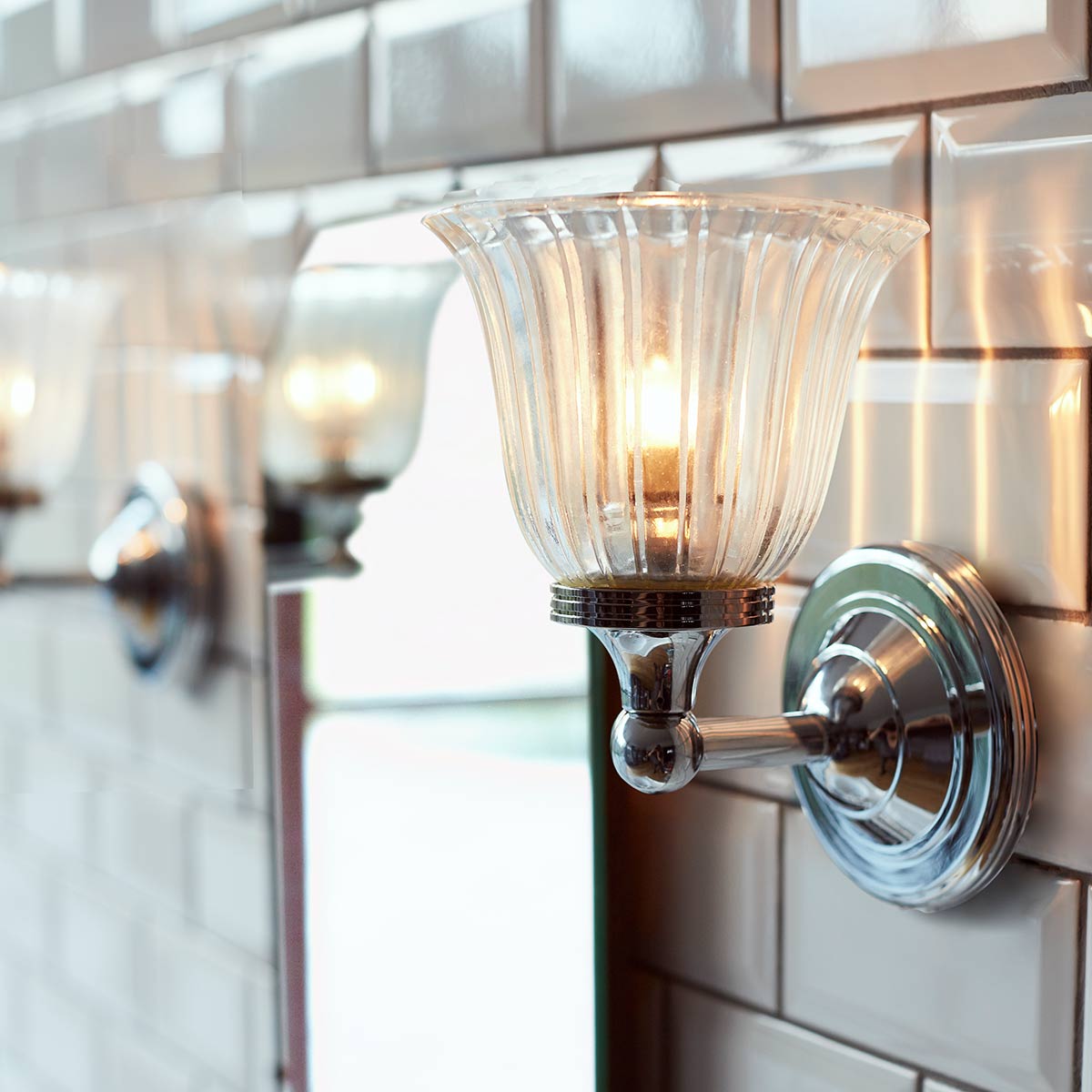 Diese kleine Wandleuchte verfügt über ein geriffeltes Glas in Tulpenform und einen Wandarm aus Messing in Chrom poliert. Dank der Schutzart IP44 eignet sie sich besonders für die Montage im Badezimmer.