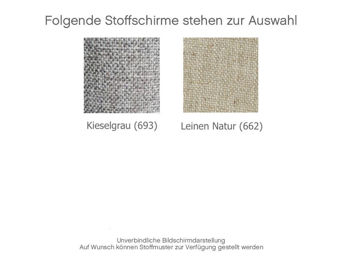 Die dreibeinige Tischleuchte hat ein bronzefarben patiniertes Gestell mit einem zylindrischen Stoffschirm (Ø 20 cm, Höhe 20 cm), der in verschiedenen Ausführungen individuell gewählt werden kann.