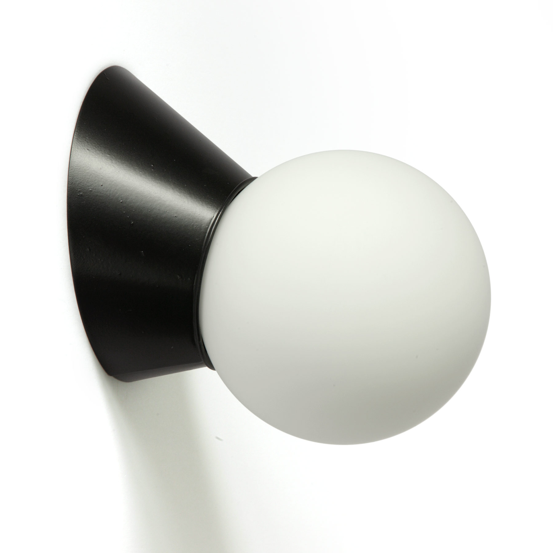 Die edle, aber schlichte Wandleuchte trägt eine kleine Glaskugel (Ø ca. 14 cm, matt-opal) auf einem minimalistisch gestalteten Sockel aus Messing oder Zink. Die Leuchte kann nach oben oder unten gerichtet montiert werden – beispielweise paarweise neben dem Spiegel.