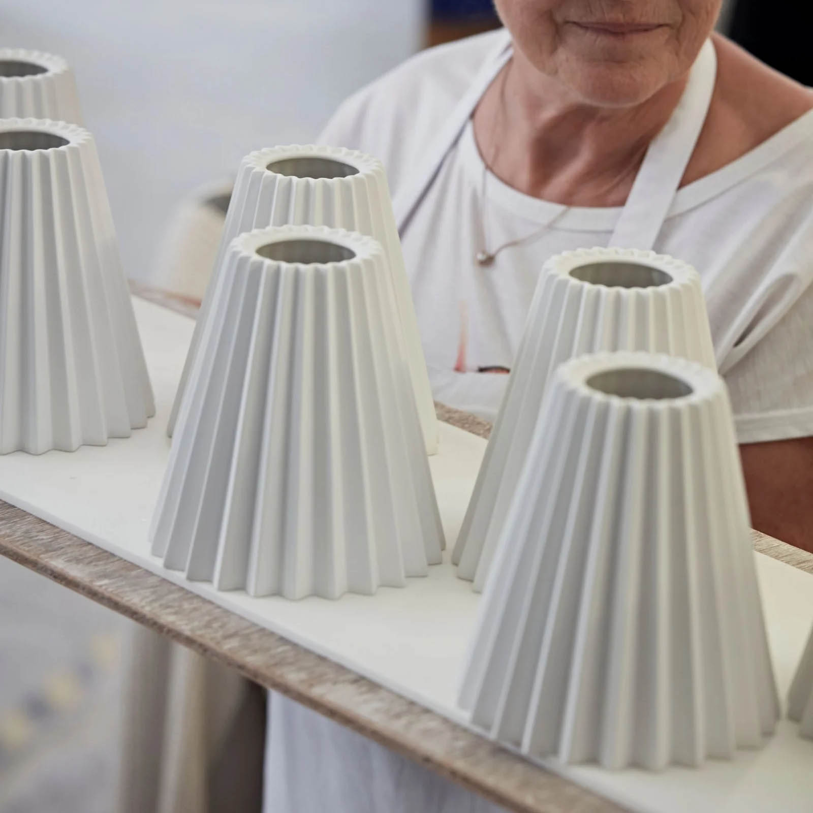 Diese handgefertigten Teile stammen aus der eigenen Porzellanmanufaktur in Stoke-on-Trent und sind charakteristisch für diesen britischen Designklassiker. Lampenschirme aus (weißem) Knochenporzellan wirken in ausgeschaltetem Zustand strahlend weiß-opak, wenn die Lampe eingeschaltet wird, schimmert das Material einen warmen, leicht orangenen Ton.