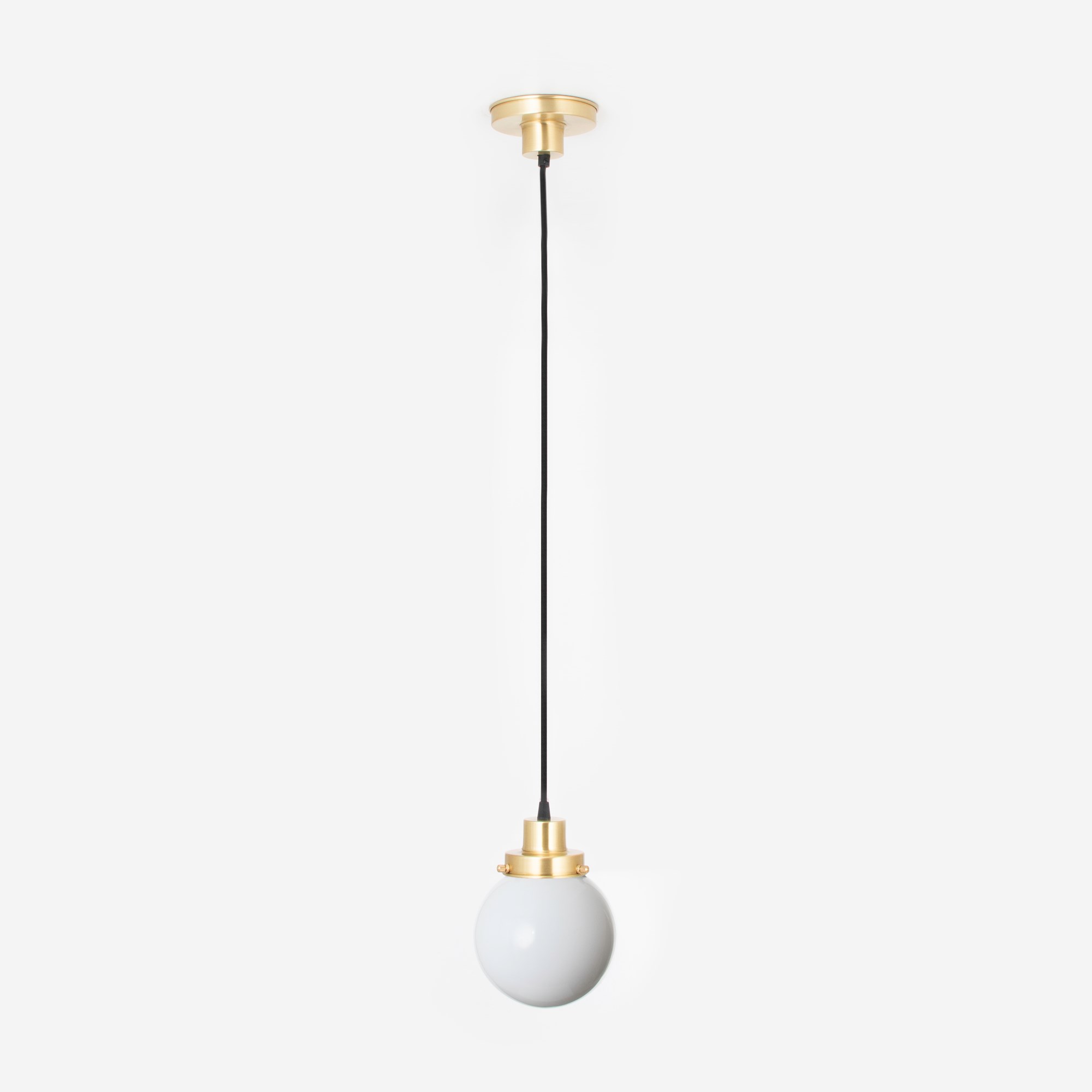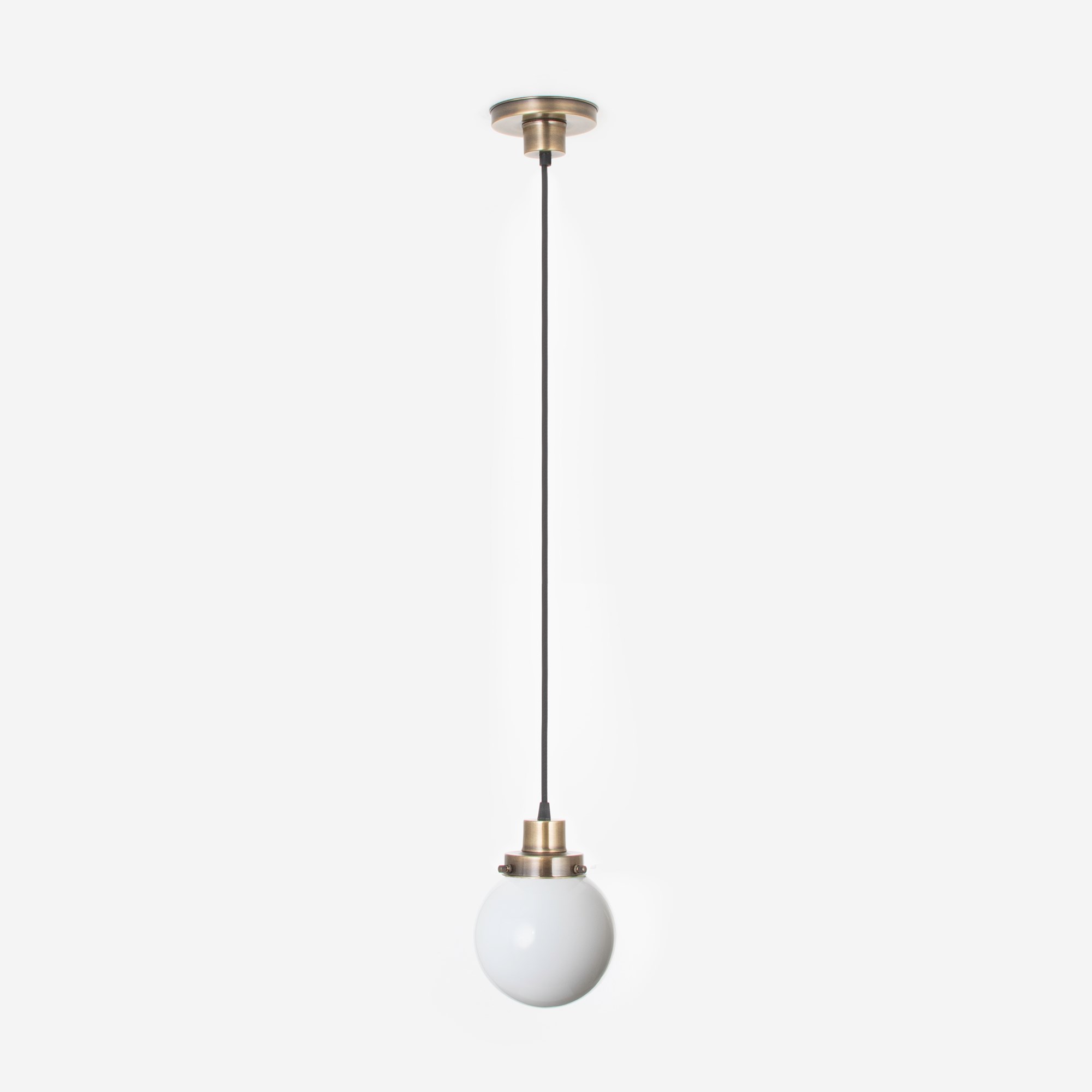 Diese schlichte, kleine Pendelleuchte mit weißer Kugel aus mundgeblasenem Opalglas und einer schwarzen Textilkabel-Aufhängung ist ein zeitloser Klassiker.