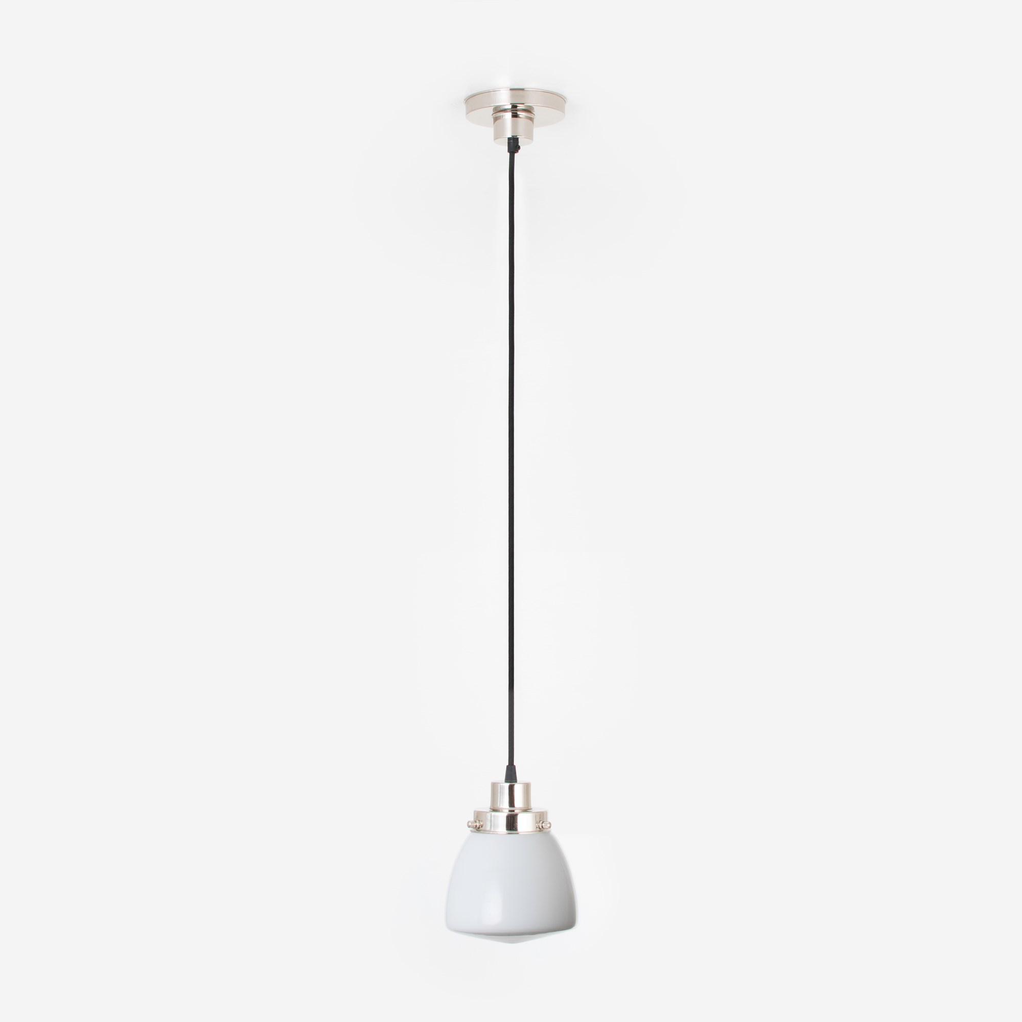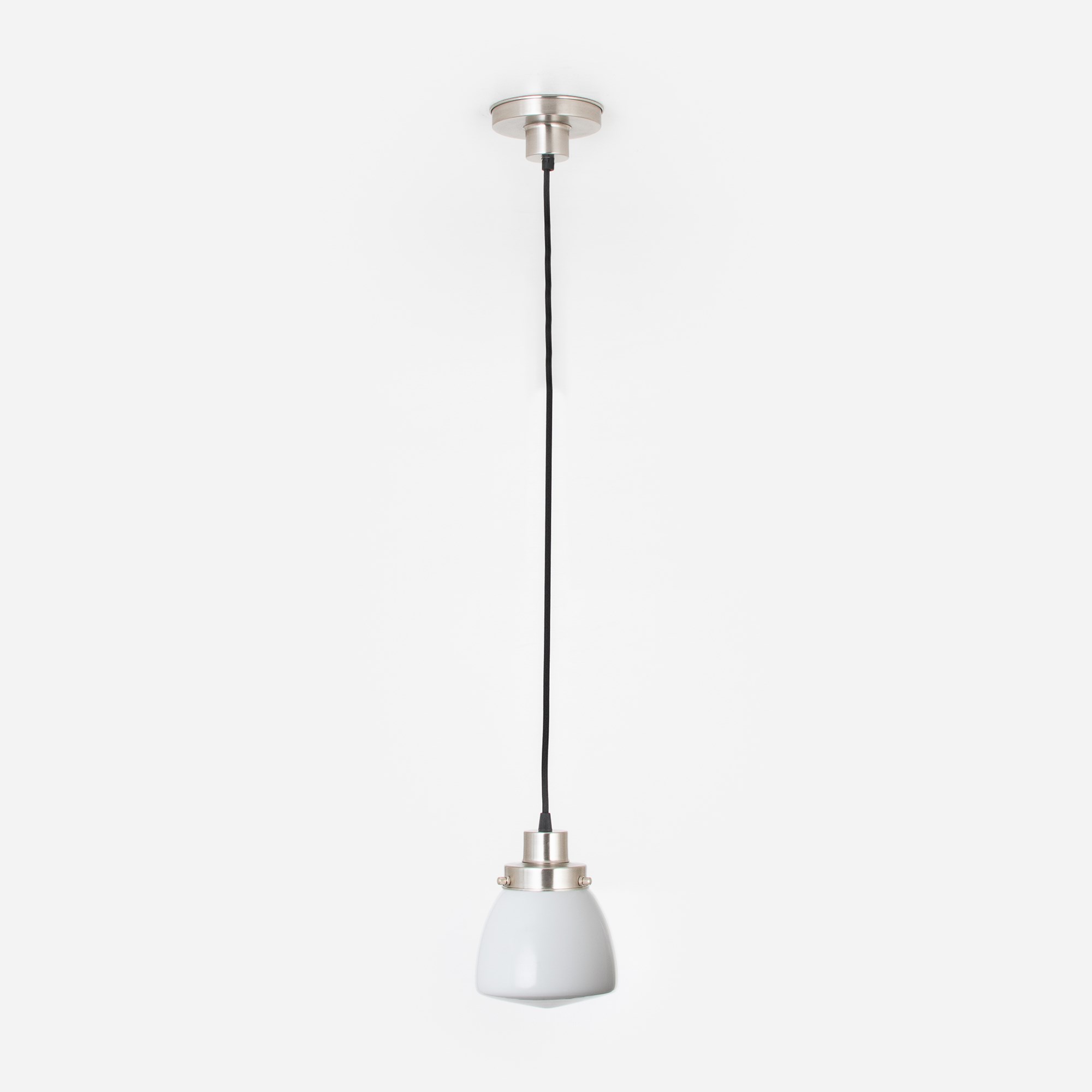 Diese nostalgische „Schulhaus“-Pendelleuchte im Stil der 20er Jahre hat einen weißen Glasschirm aus mundgeblasenem Opalglas an einer schwarzen Textilkabel-Aufhängung. Das hochwertige Opalglas sorgt für sanft gestreutes, blendarmes Licht.