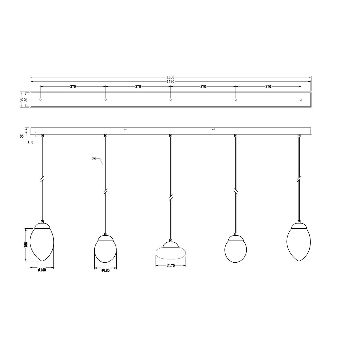 Reihe aus fünf Glasschirm-Hängeleuchten VITROLO (LED) auf Leiste