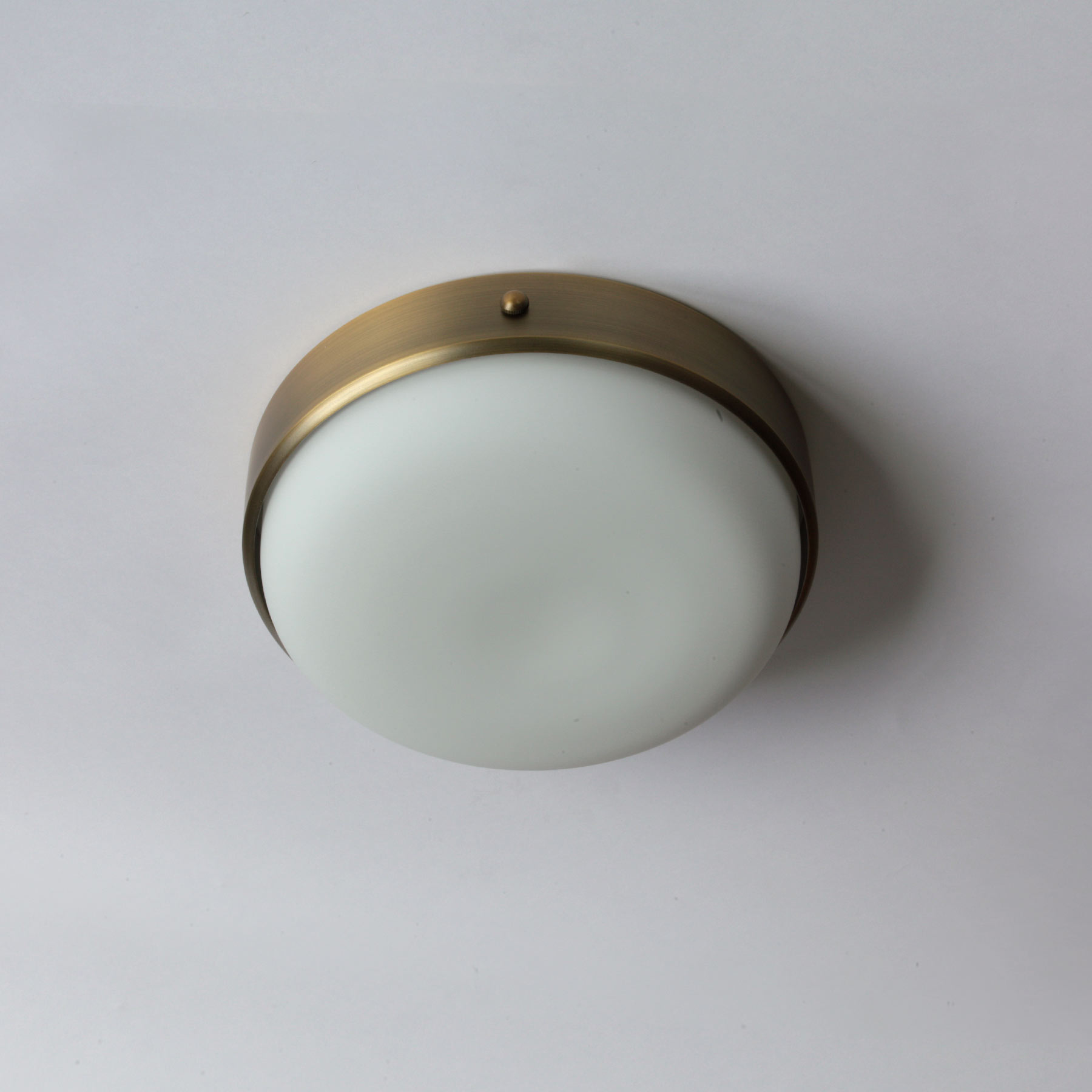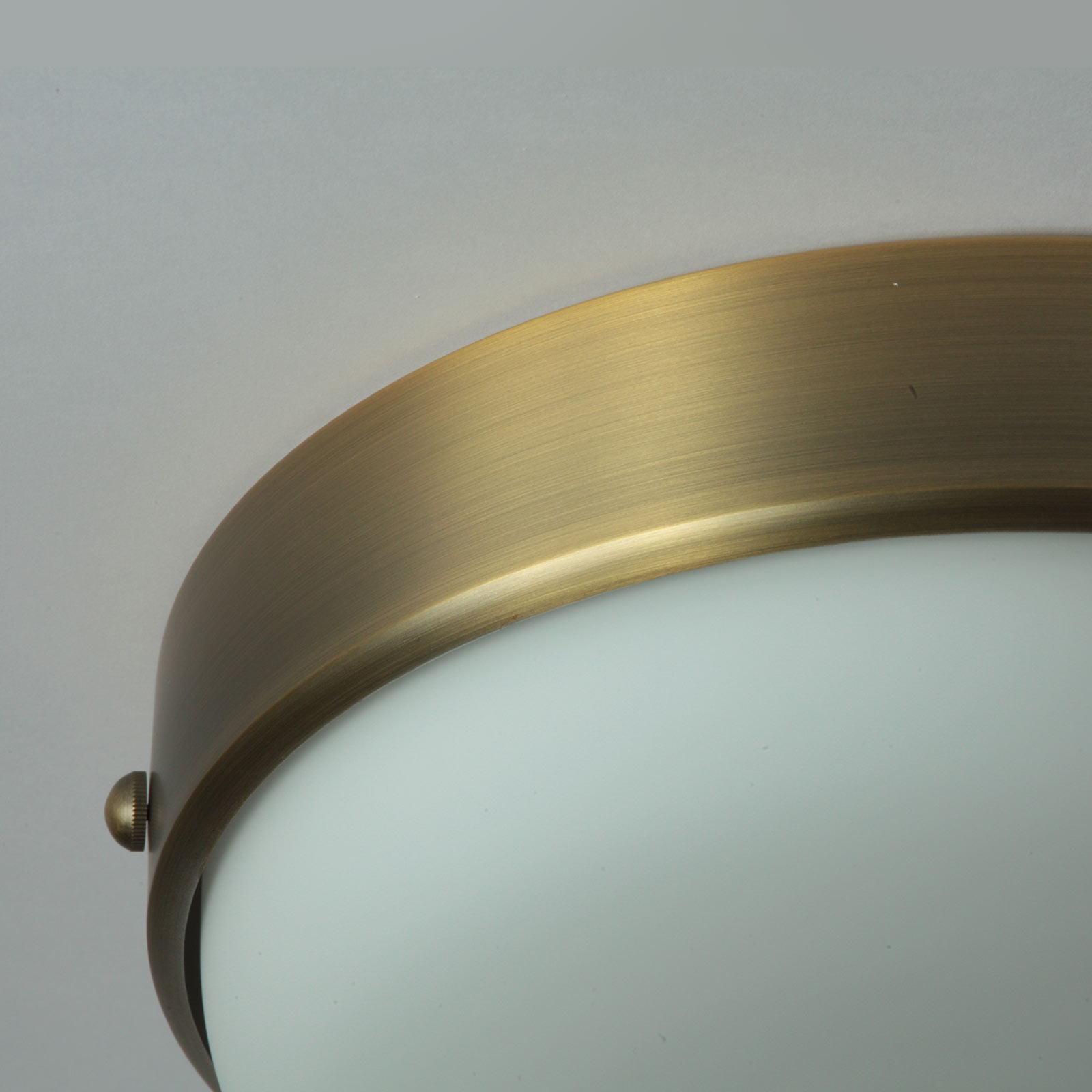 Schlichte, runde Deckenleuchte mit schönem, mattem Opalglas-Schirm mit abgeflachter Wölbung, der zwei E27-Brennstellen verbirgt und von einer messing-/bronzefarbenen Halterung umfasst wird.