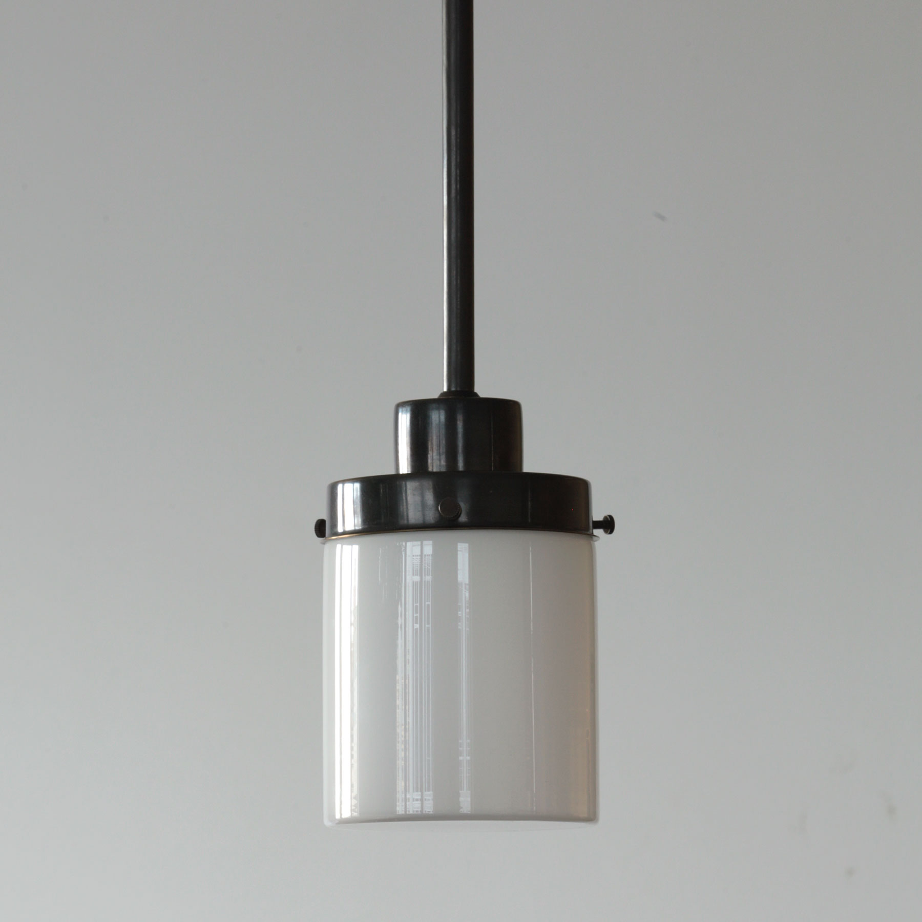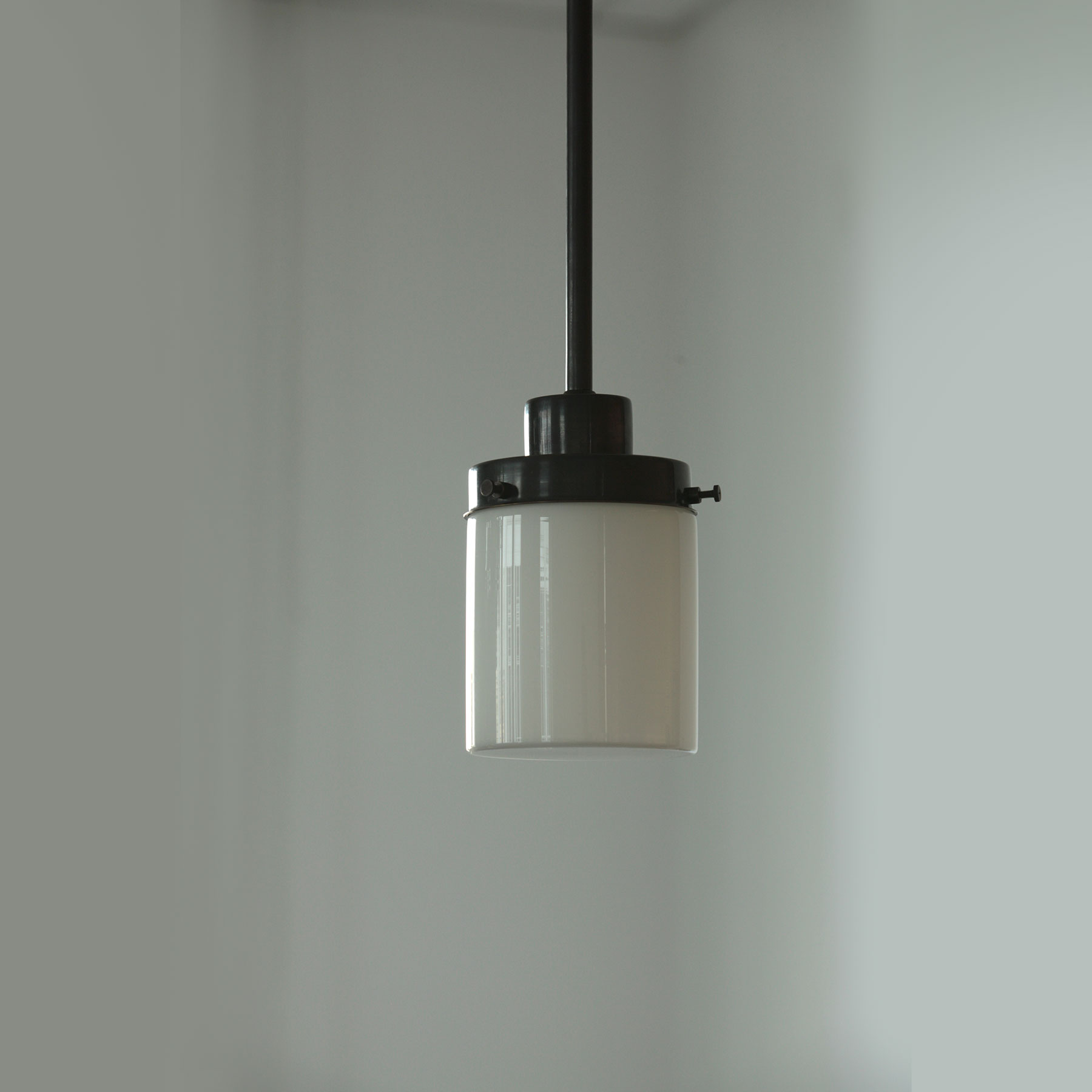 Kleine Stab-Pendelleuchte mit einem zylindrischen Opalglas-Schirm (Ø 11 cm).