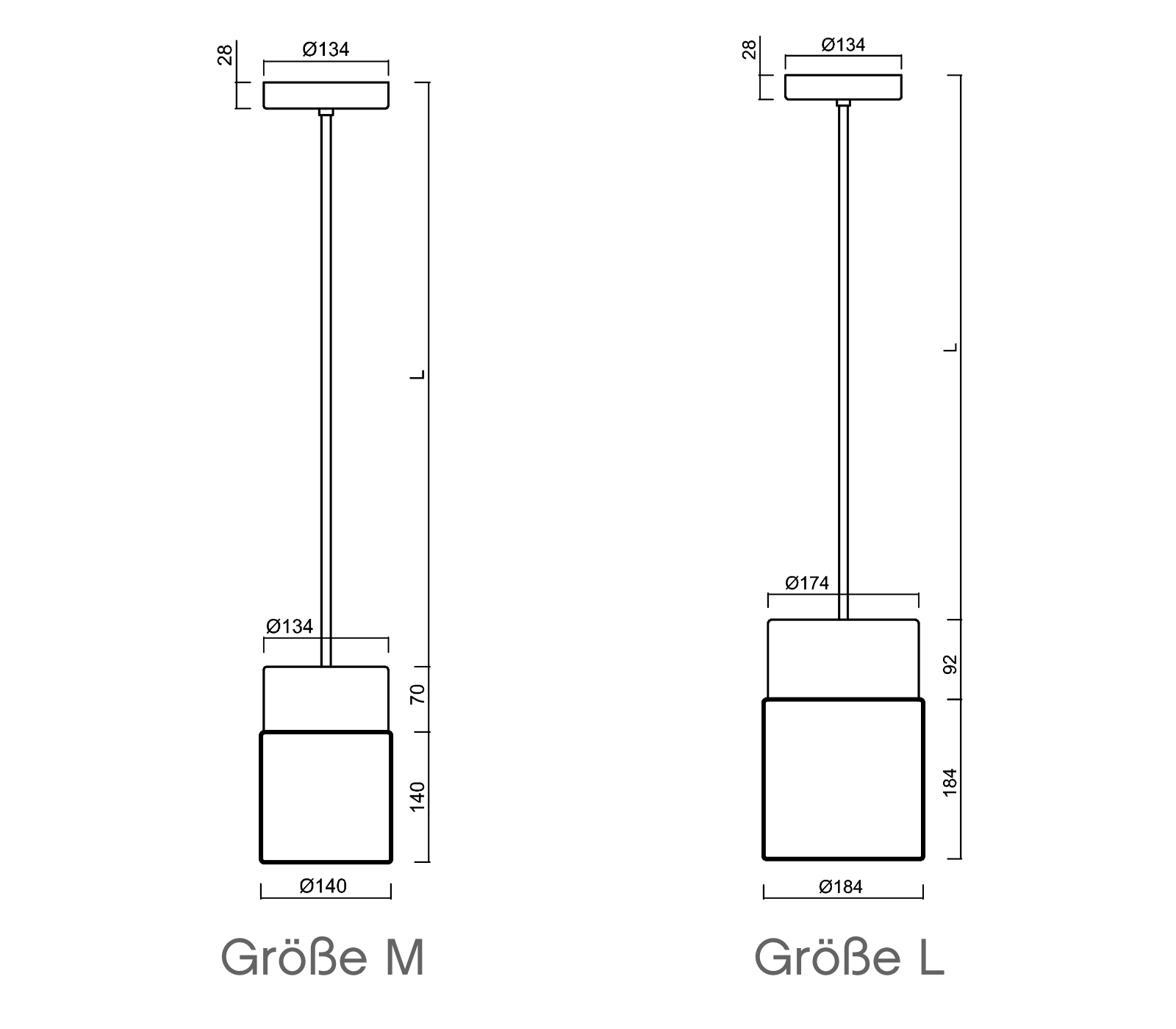 Den Glasschirm der Zylinder-Hängelampe gibt es mit Ø 14 cm und Ø 18,4 cm Durchmesser.