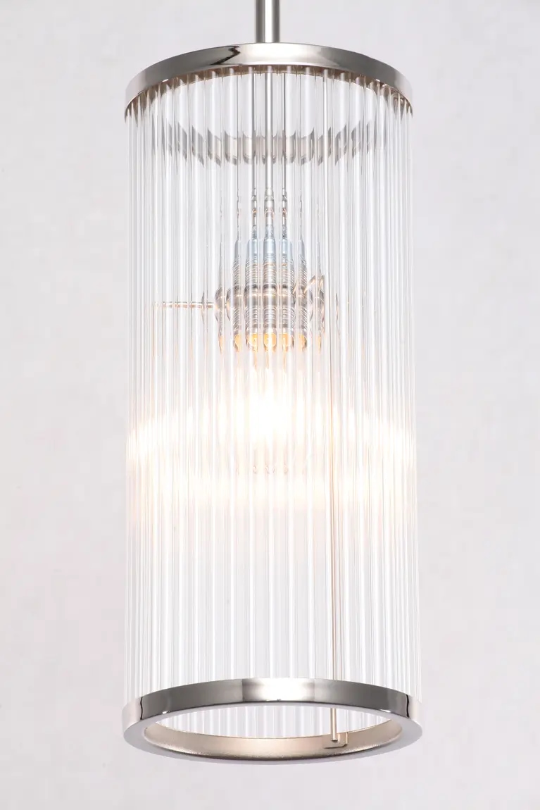 Der Schirm dieses von Hand gefertigten Nachbaus einer schmalen Stab-Deckenleuchte verbreitet ein unvergleichliches Raumlicht durch den Einsatz filigrane Kristallglasstäbchen, die typisch sind für die Zeit um 1910. Auch das Gestänge ist von Glasstäbchen umschlossen.