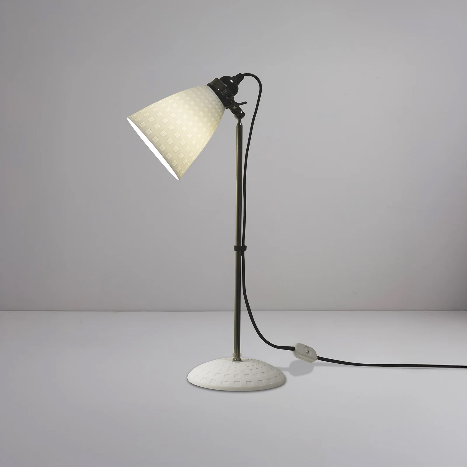 Die Tischleuchte HECTOR21 ist mit dem Schaft aus gebürstetem, dunkel vernickeltem Messing in der Höhe verstellbar, die Zuleitung erfolgt über ein schönes, mit Baumwolle ummanteltes schwarzes Textilkabel mit weißem Schalter (ca. 180 cm, Schalter nach ca. 35 cm).
