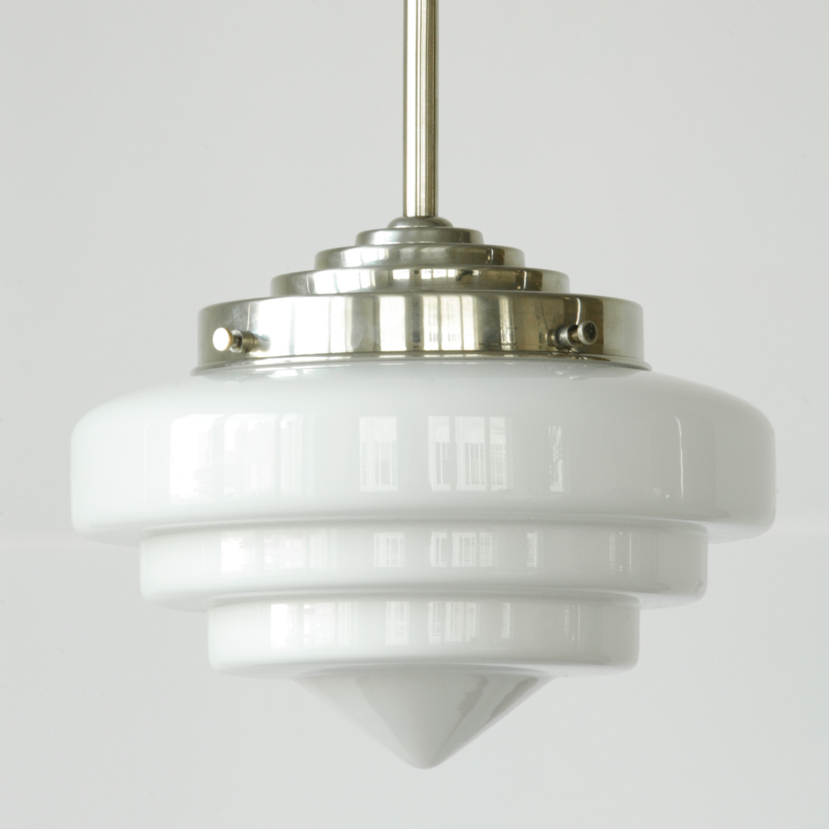 Das getreppte Spitz-Opalglas, der dreifach gestufte Baldachin sowie die ebenfalls dreifach gestufte Halterung der Decken-Stabpendelleuchte sorgen für ein stimmiges Gesamtbild. Die Leuchte gibt es in zwei Größen.