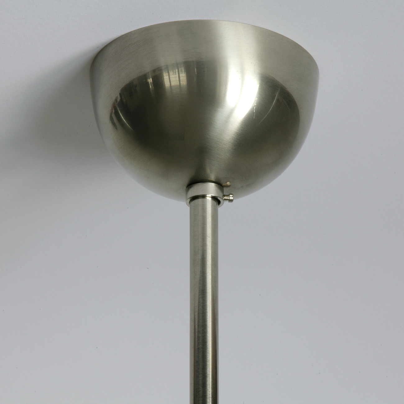 Art déco-Pendelleuchte mit Würfel-Opalglas, das von einem dezent gestuften Messing-Glashalter mit Pendelrohr und Halbkugel-Baldachin in vier wählbaren Oberflächen gehalten wird.