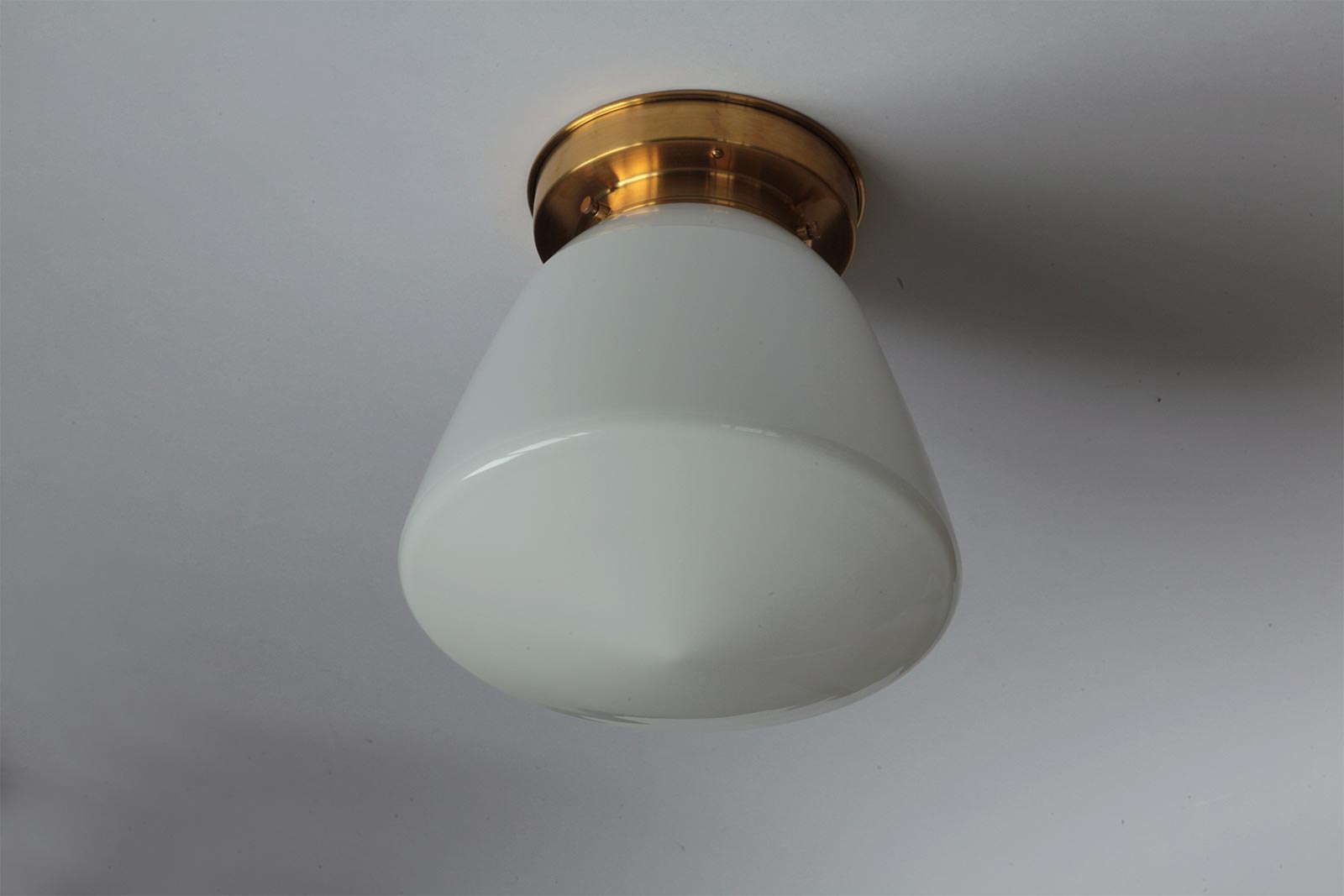 Alle Leuchten von Collectie Art déco sind aus Messing in unterschiedlichen Oberflächen gefertigt, mundgeblasene überfangene (zweischichtige) Opalgläser bzw. mundgeblasene geschliffene satinierte Gläser sorgen für weitgehend blendfreies Licht bei maximaler Lichtdurchlässigkeit – holländischer Funktionalismus.