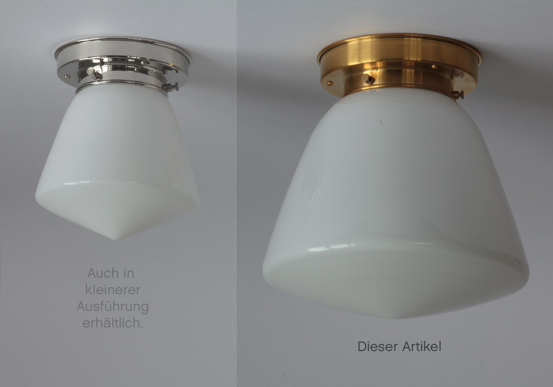 Material: Messing in unterschiedlichen Oberflächen, überfangenes (zweischichtiges) mundgeblasenes Opalglas.