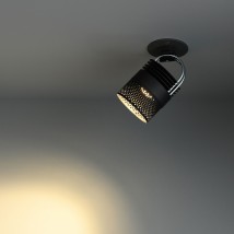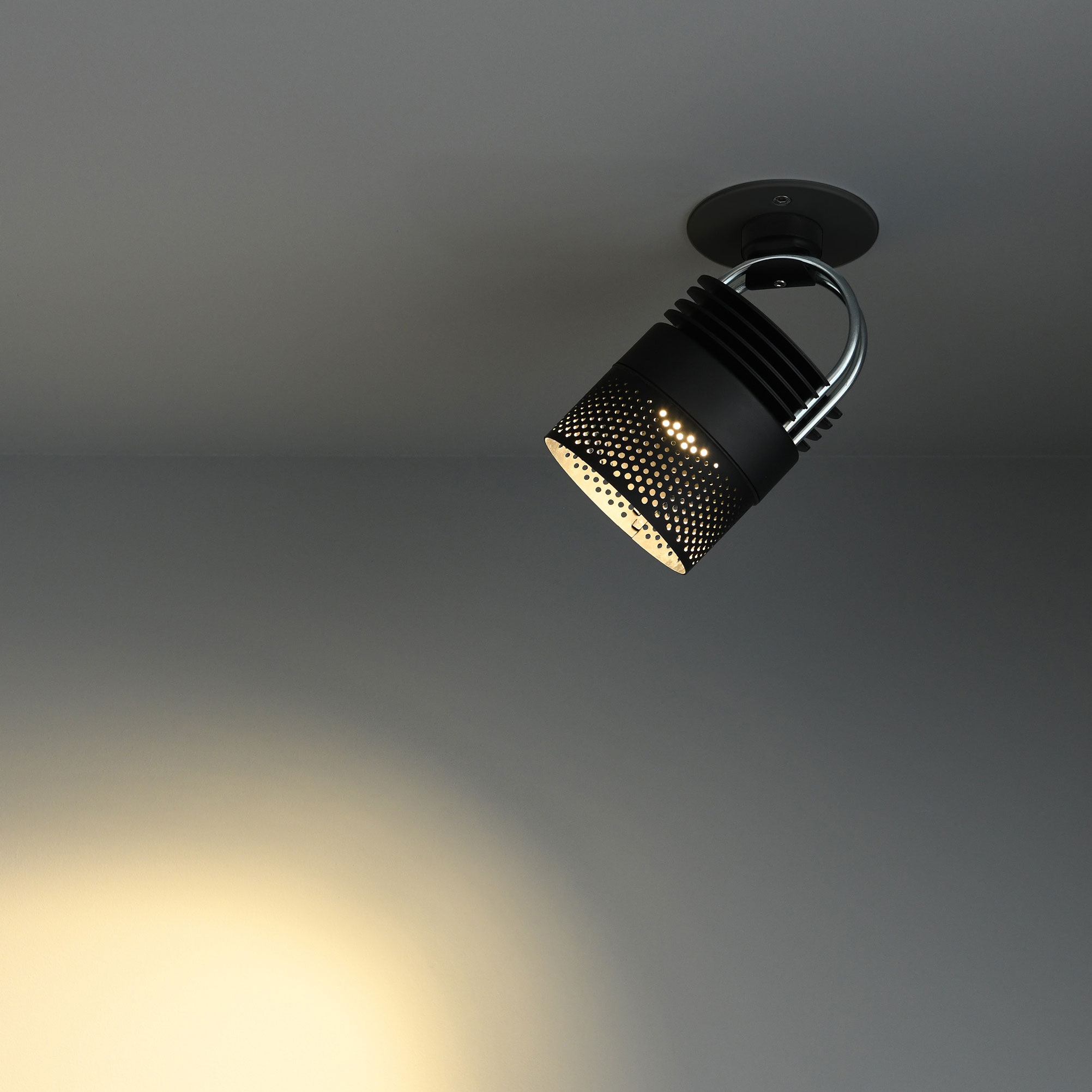 Bestückt mit einer perforierten Blende oder einem Schirm aus getöntem Glas setzt er als Leselicht, zum Beispiel am Bett, einen angenehmen, dezenten Lichtakzent im Raum. In der Version Bronze mit Rauchglasschirm sorgt er als Deckenstrahler für ein modernes und wohnliches Ambiente.