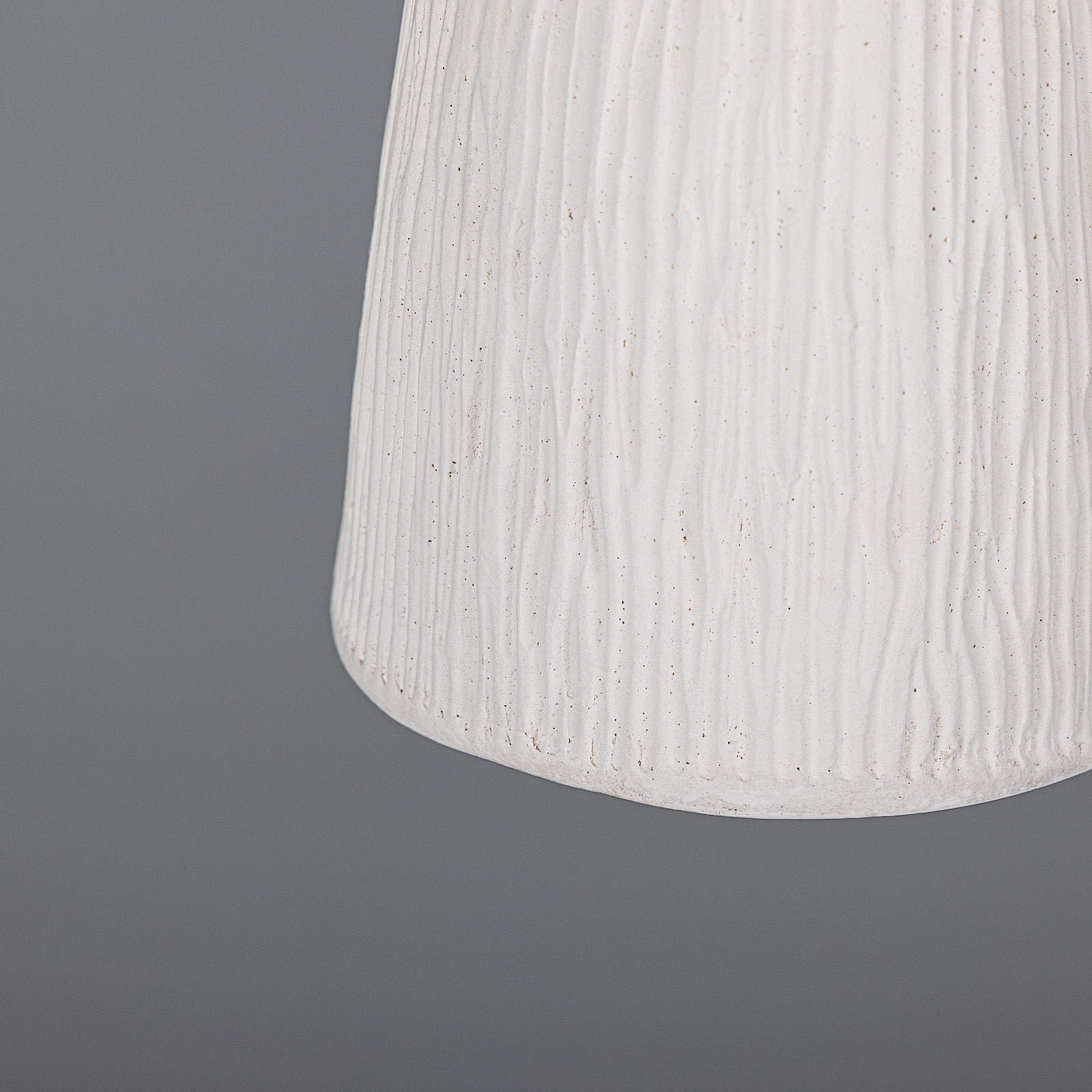 Die gekerbte Rillenstruktur der matt-weißen, rustikal getöpferten Keramik verleiht dem Design eine lebendige Tiefe.