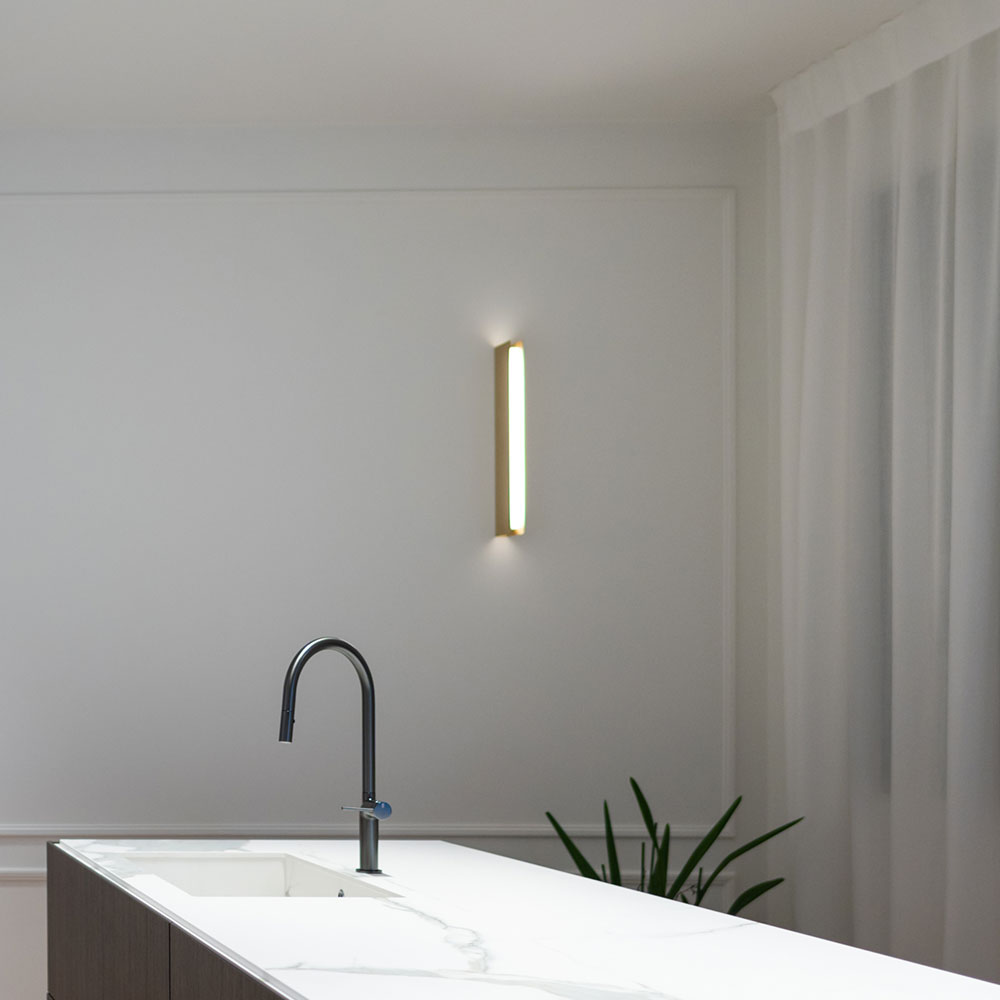 Die Lichtquelle, ein integrierter LED-Streifen hinter opalem Acrylglas, wird durch die Messing-Blende eingerahmt.
