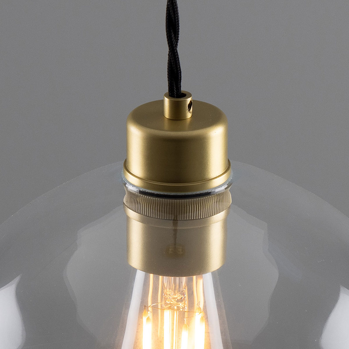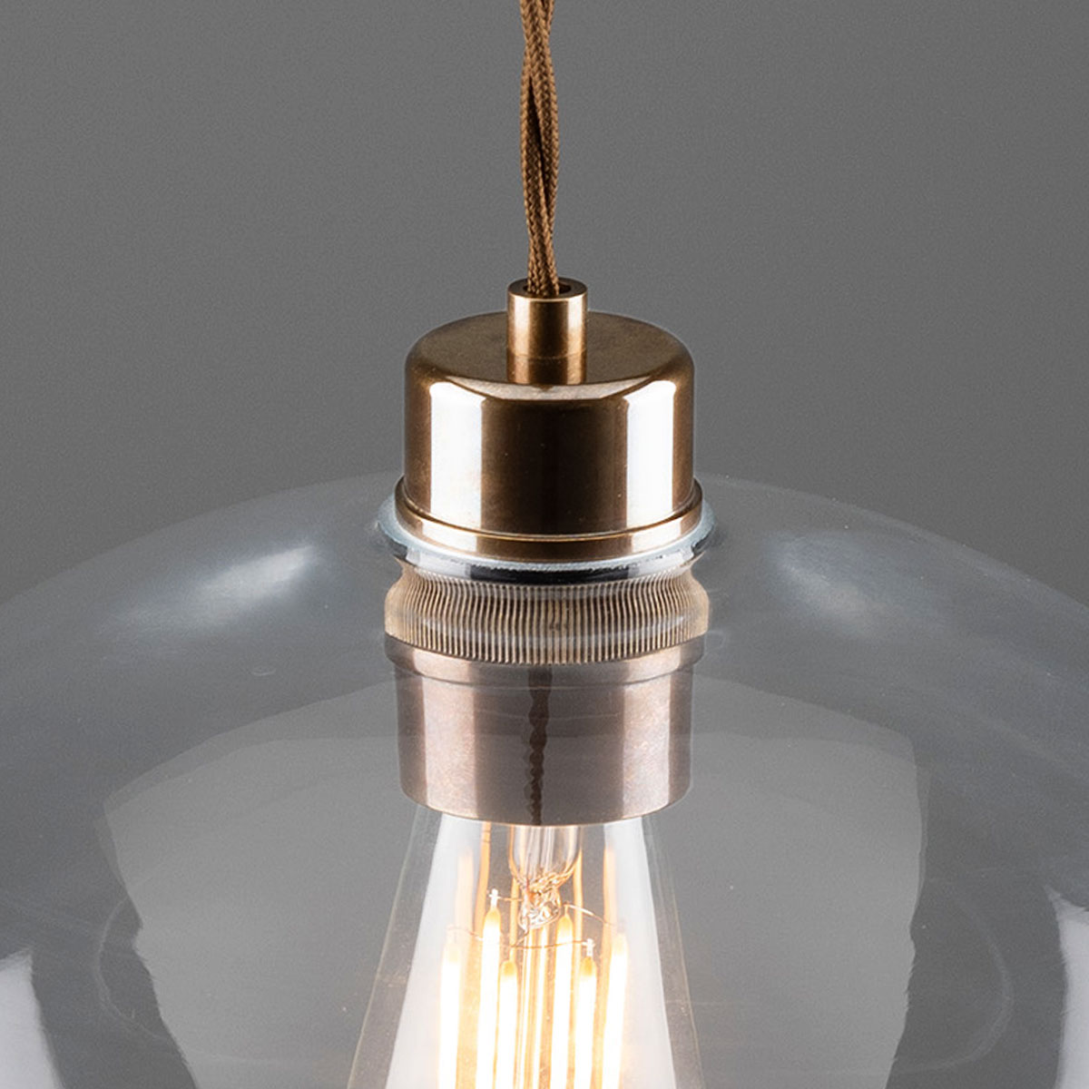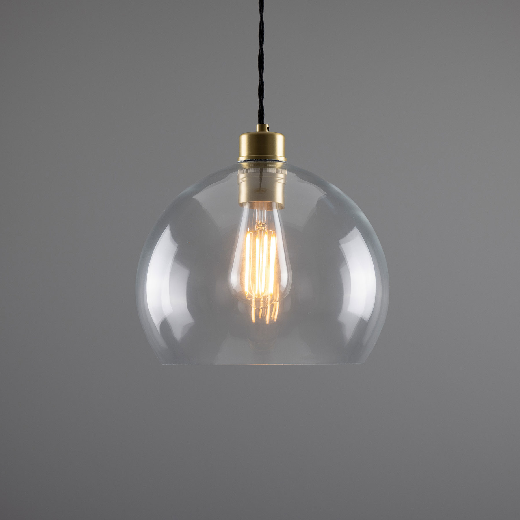 Ebenso schlicht wie beeindruckend wirkt diese zeitlose Pendelleuchte mit angeschnittenem Kugelschirm aus klarem Glas („Goldfischglas”). Sie wird von Hand in Irland aus Messing gefertigt und lässt sich besonders effektvoll mit einer optional erhältlichen „Edison“-Filament-Birne bestücken.