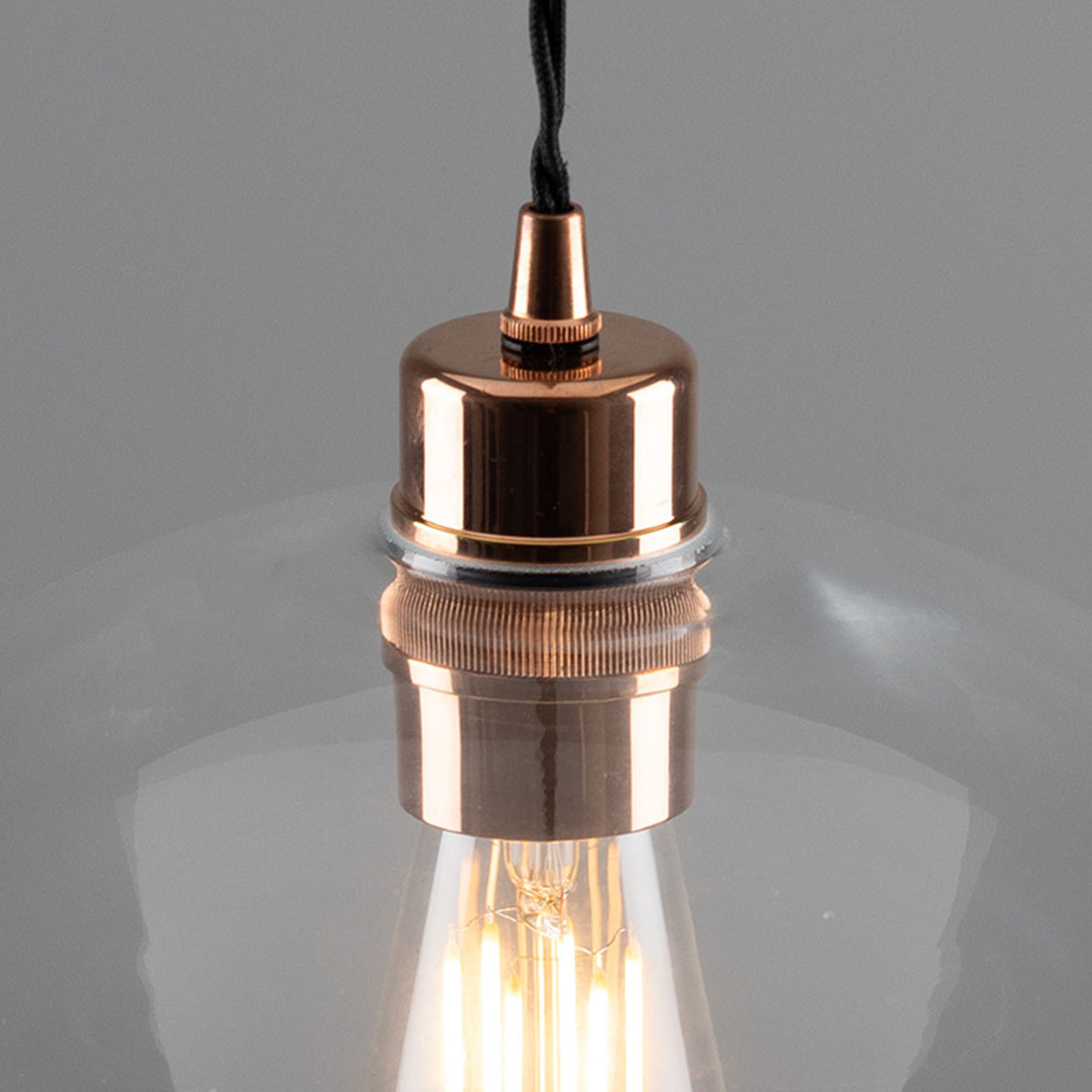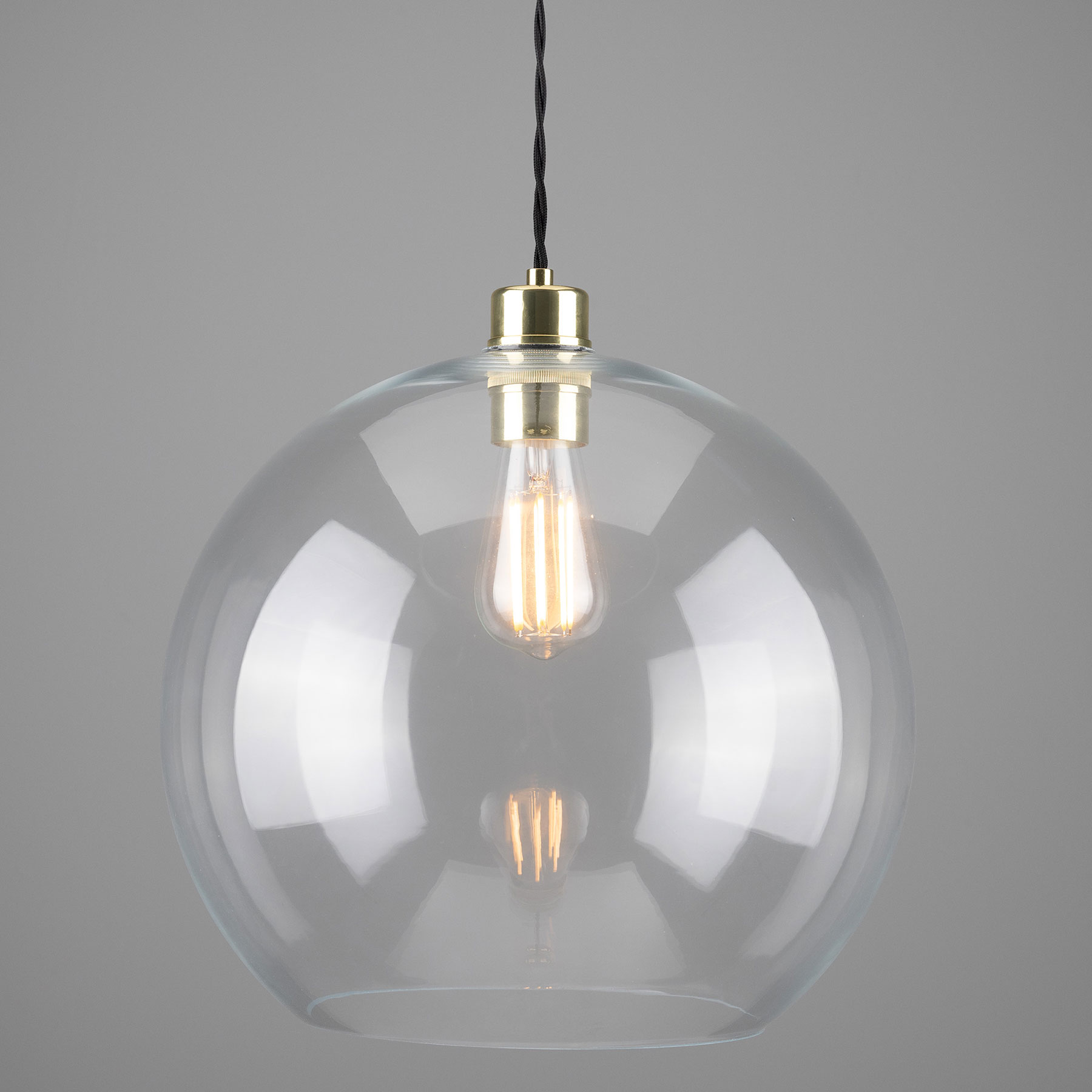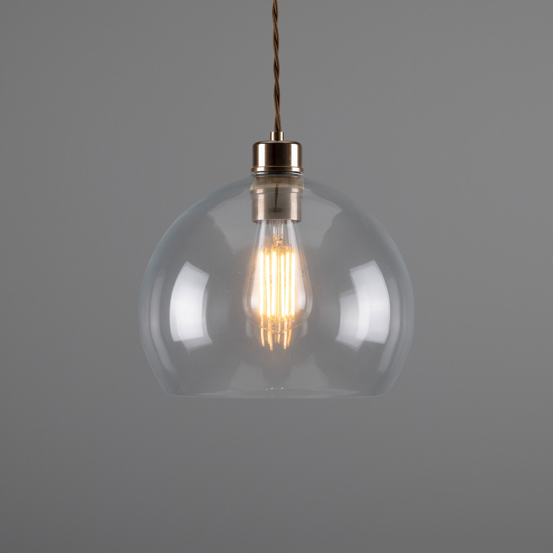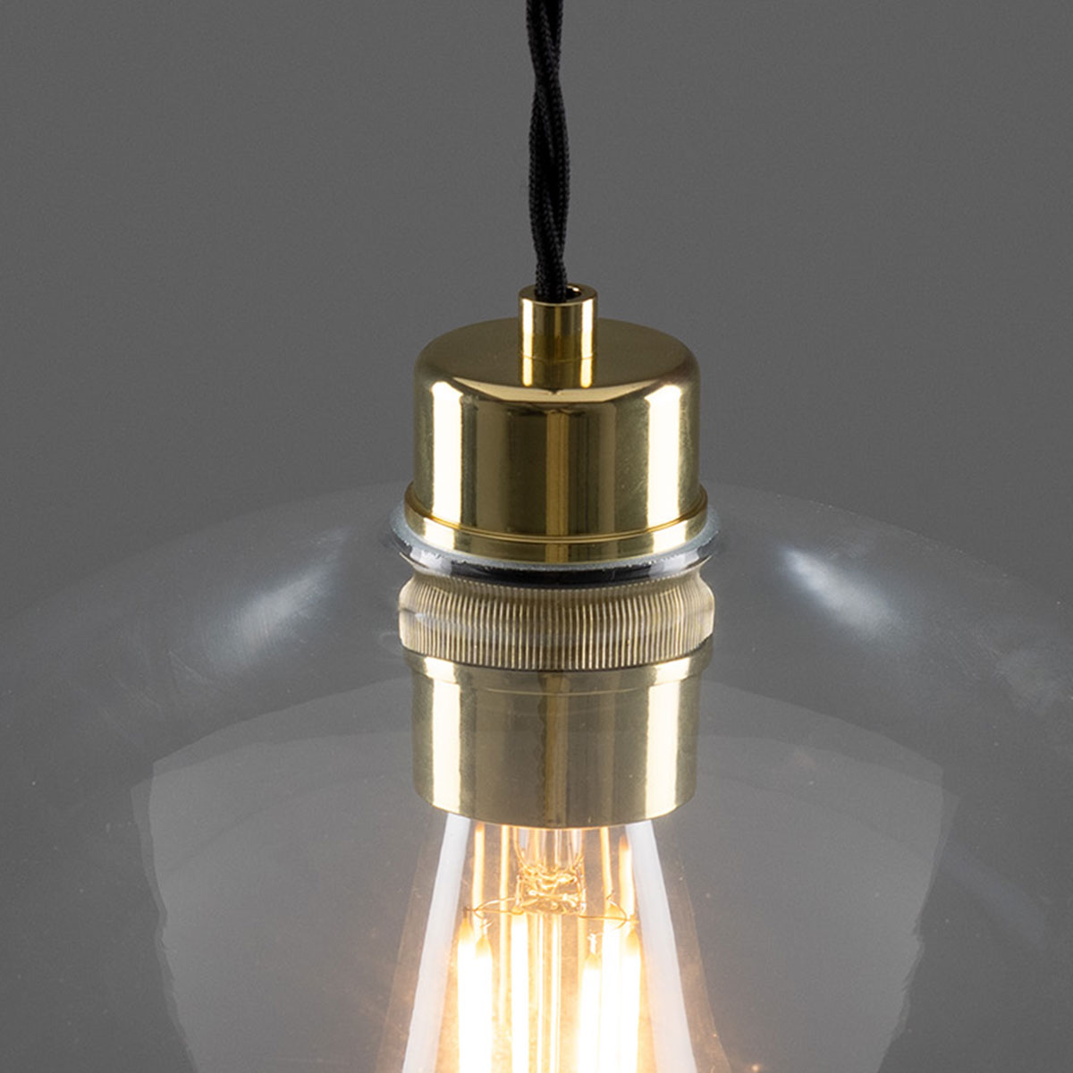 Ebenso schlicht wie beeindruckend wirkt diese zeitlose Pendelleuchte mit angeschnittenem Kugelschirm aus klarem Glas („Goldfischglas”). Sie wird von Hand in Irland aus Messing gefertigt und lässt sich besonders effektvoll mit einer optional erhältlichen „Edison“-Filament-Birne bestücken.