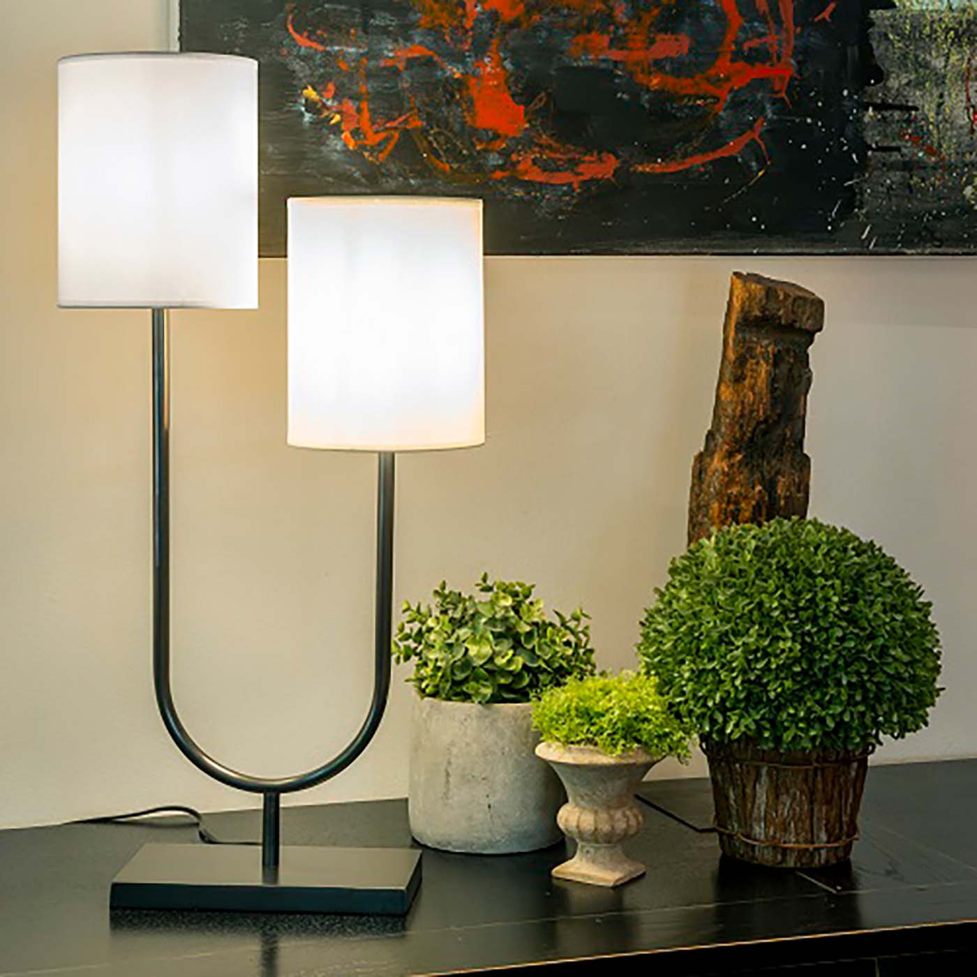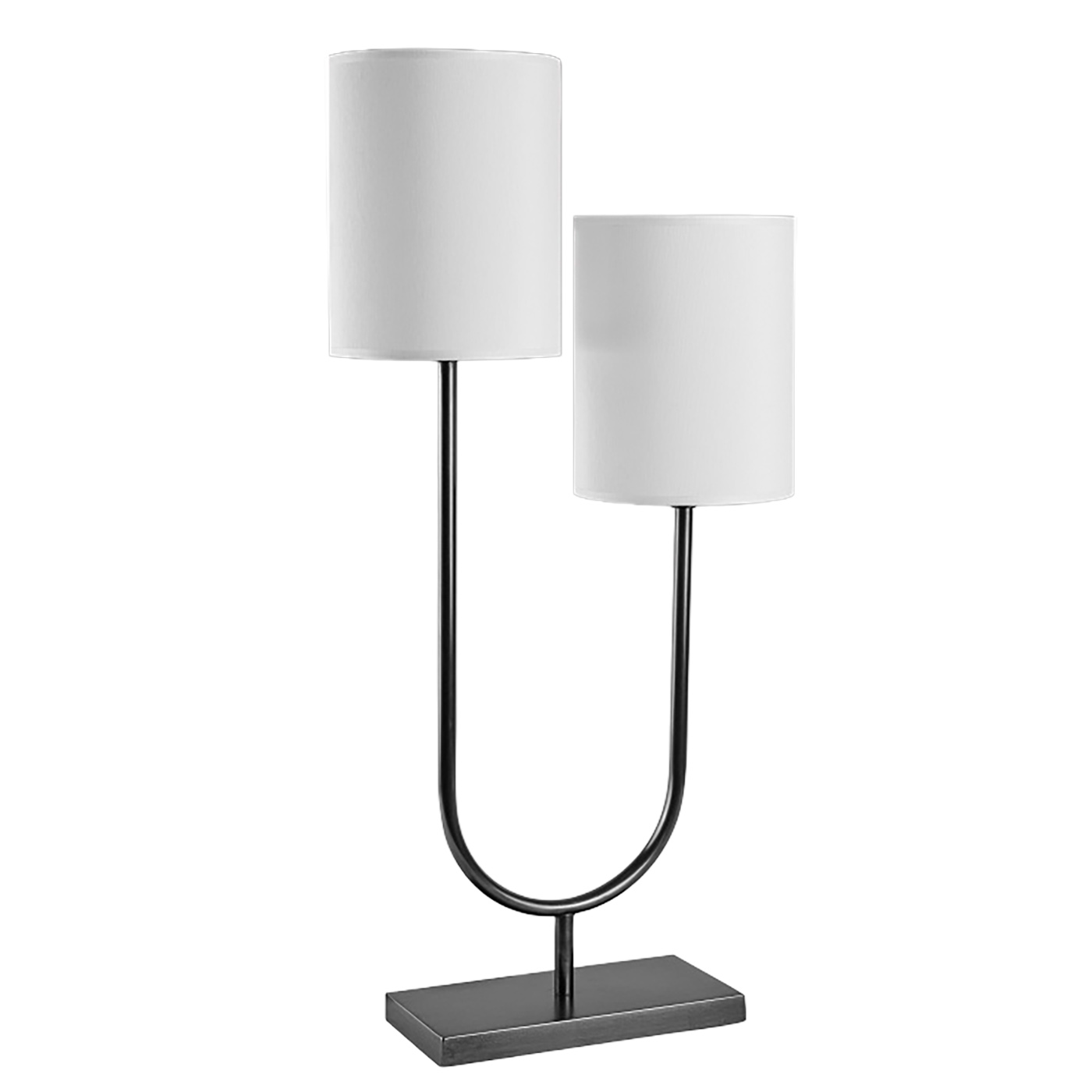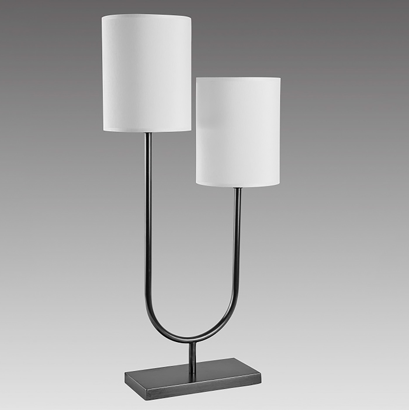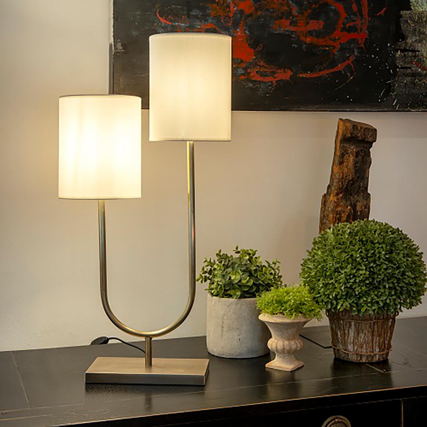 Zweiflammige Design-Tischleuchte mit zwei runden Stoffschirmen L201