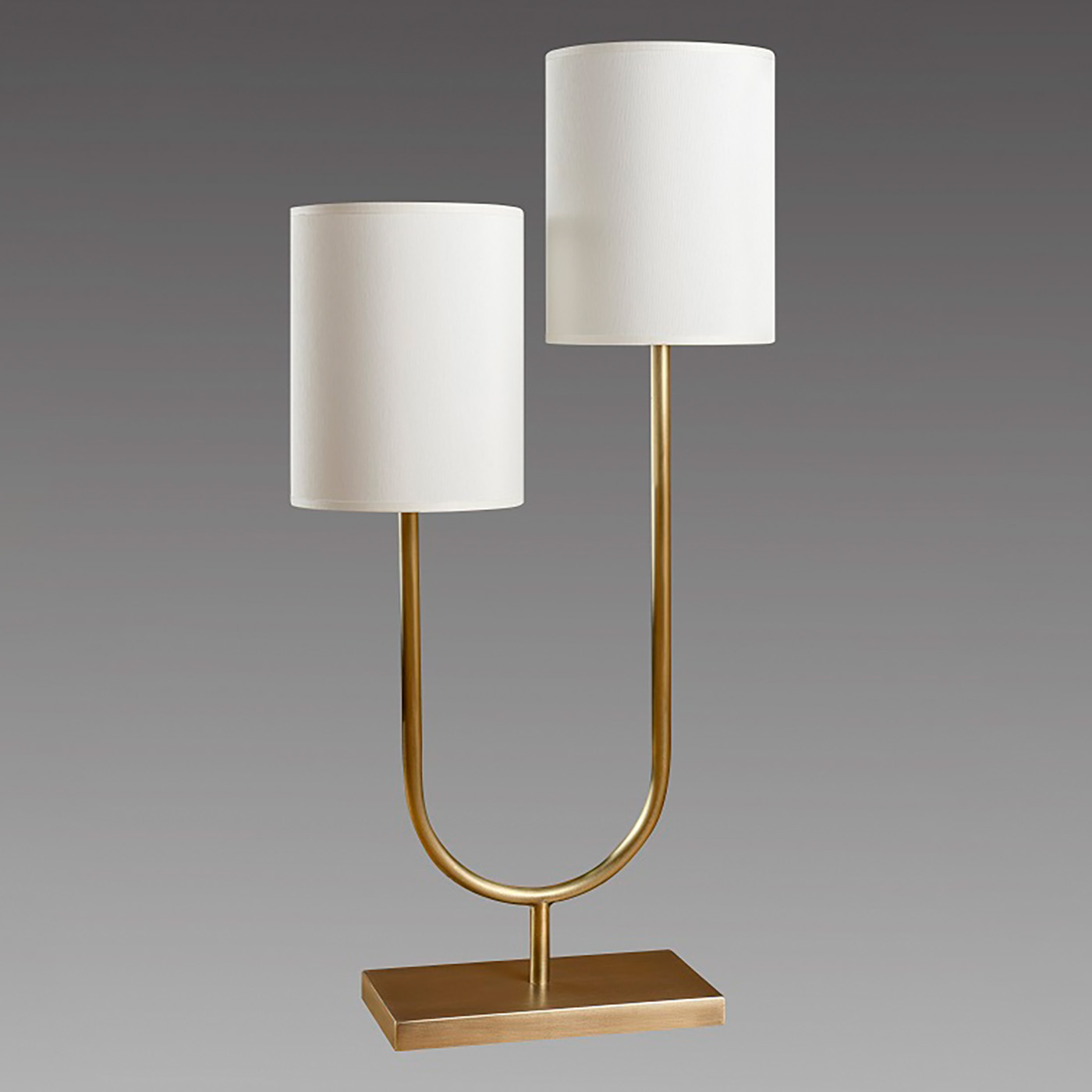 Diese zweiflammige Tischleuchte erinnert mit ihrem U-förmigen Fuß aus schlanken Messingrohren an einen Kerzenhalter.