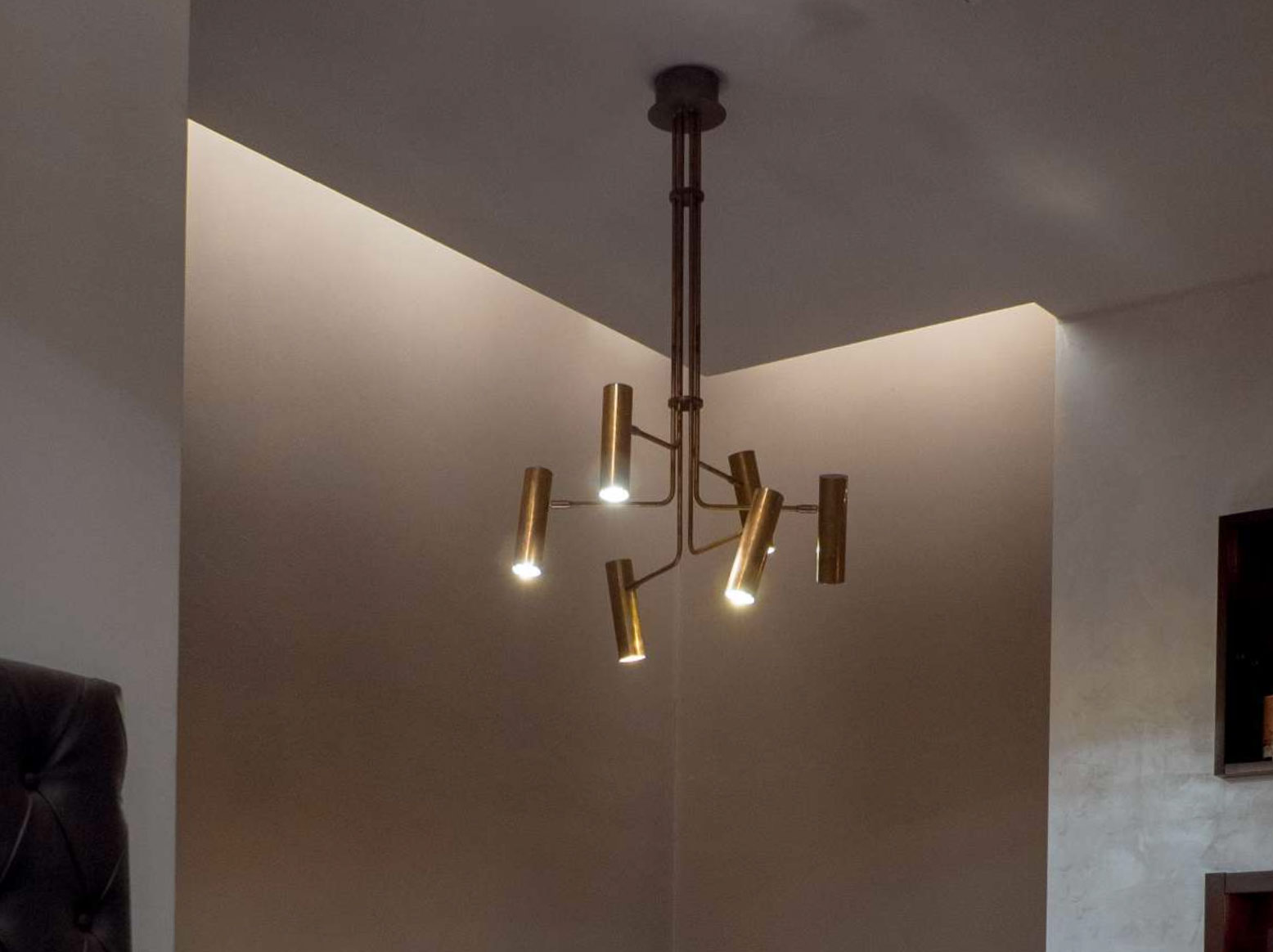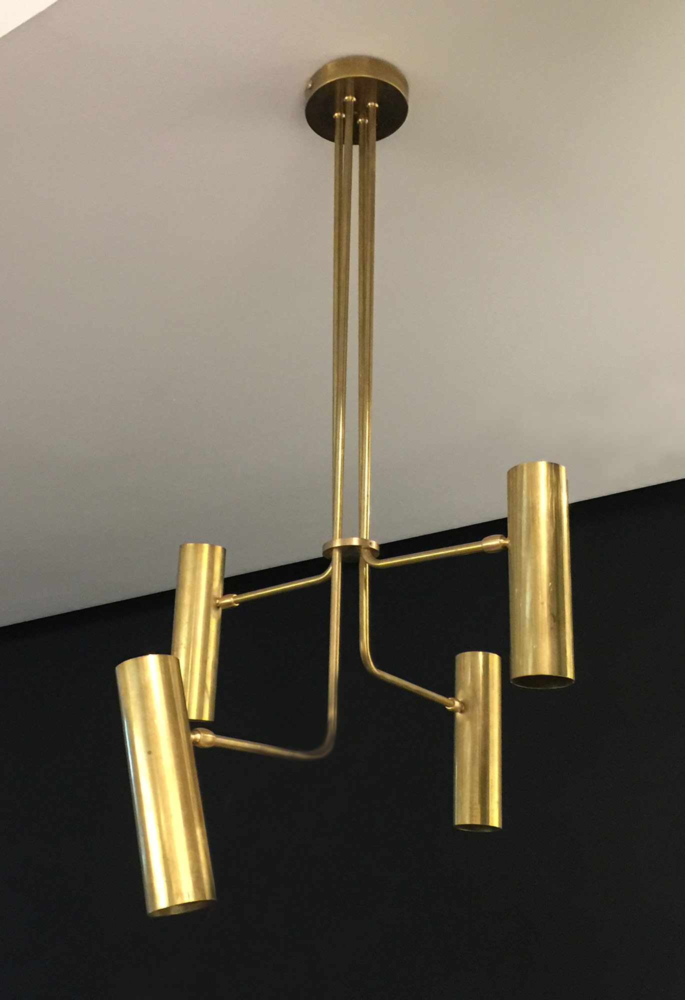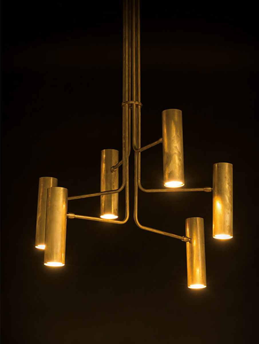 This exclusive brass chandelier has four, six, or eight GU10 spotlights in a cylindrical brass housing that can be adjusted using a joint (30° tilt, rotatable).