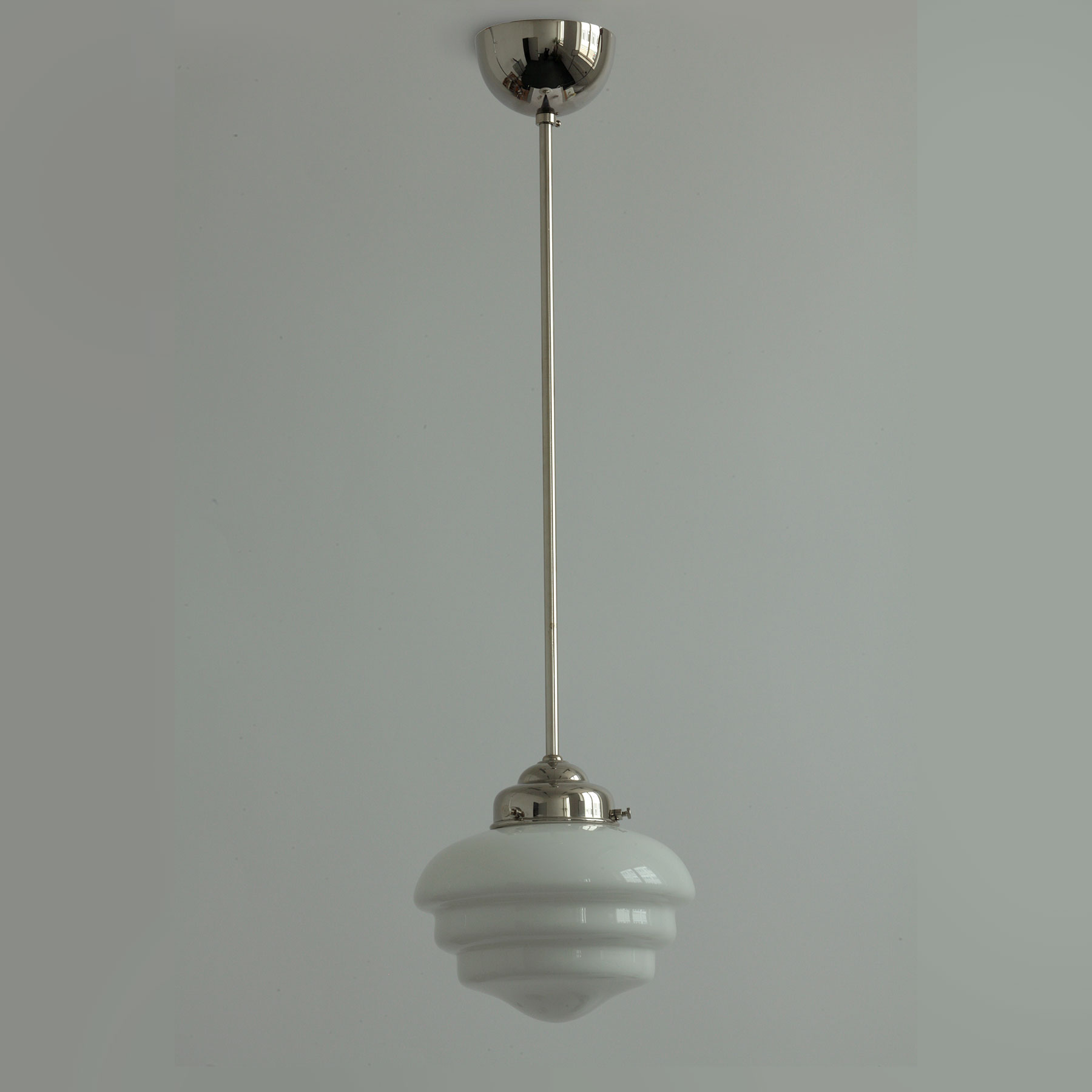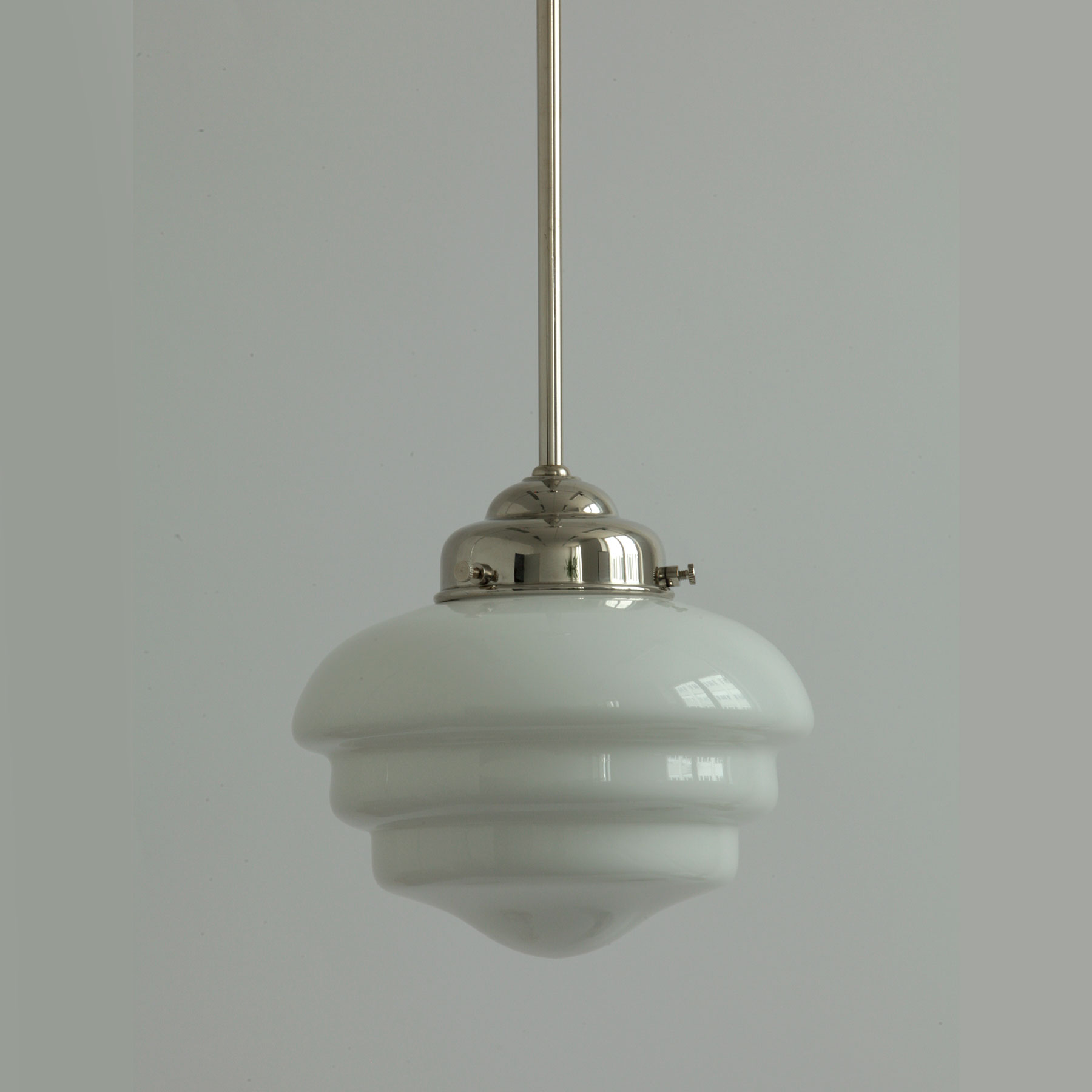 A charming small pendant light featuring Art Deco opal glass, held in place by a subtly stepped brass glass holder with a tubular suspension rod and a hemispherical canopy, available in four finishes.