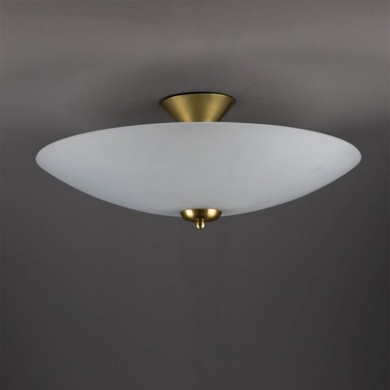 This ceiling light consists of a flat, semi-transparent frosted glass shade with a diameter of 41 cm or 50 cm, which acts as a diffuser for two E14 sockets. It is mounted to the ceiling using an elegant, vintage-style brass bracket.