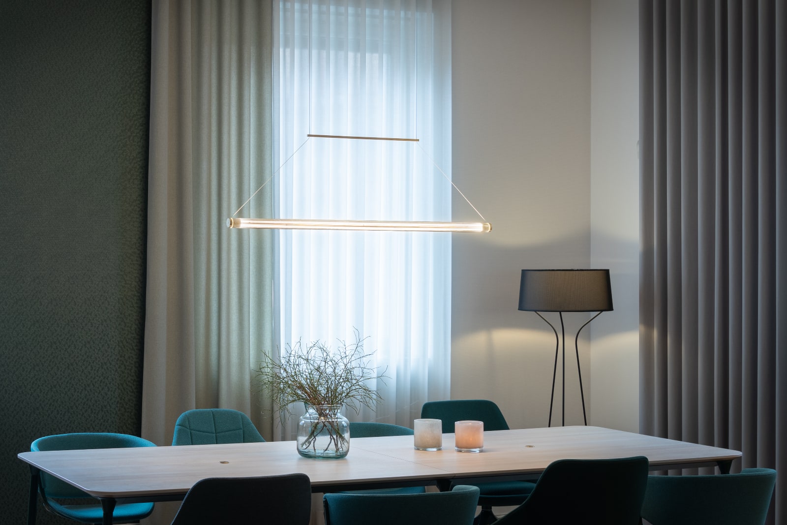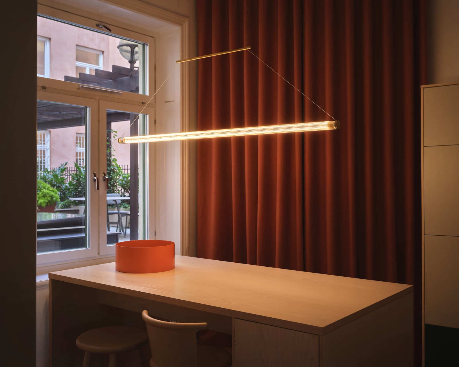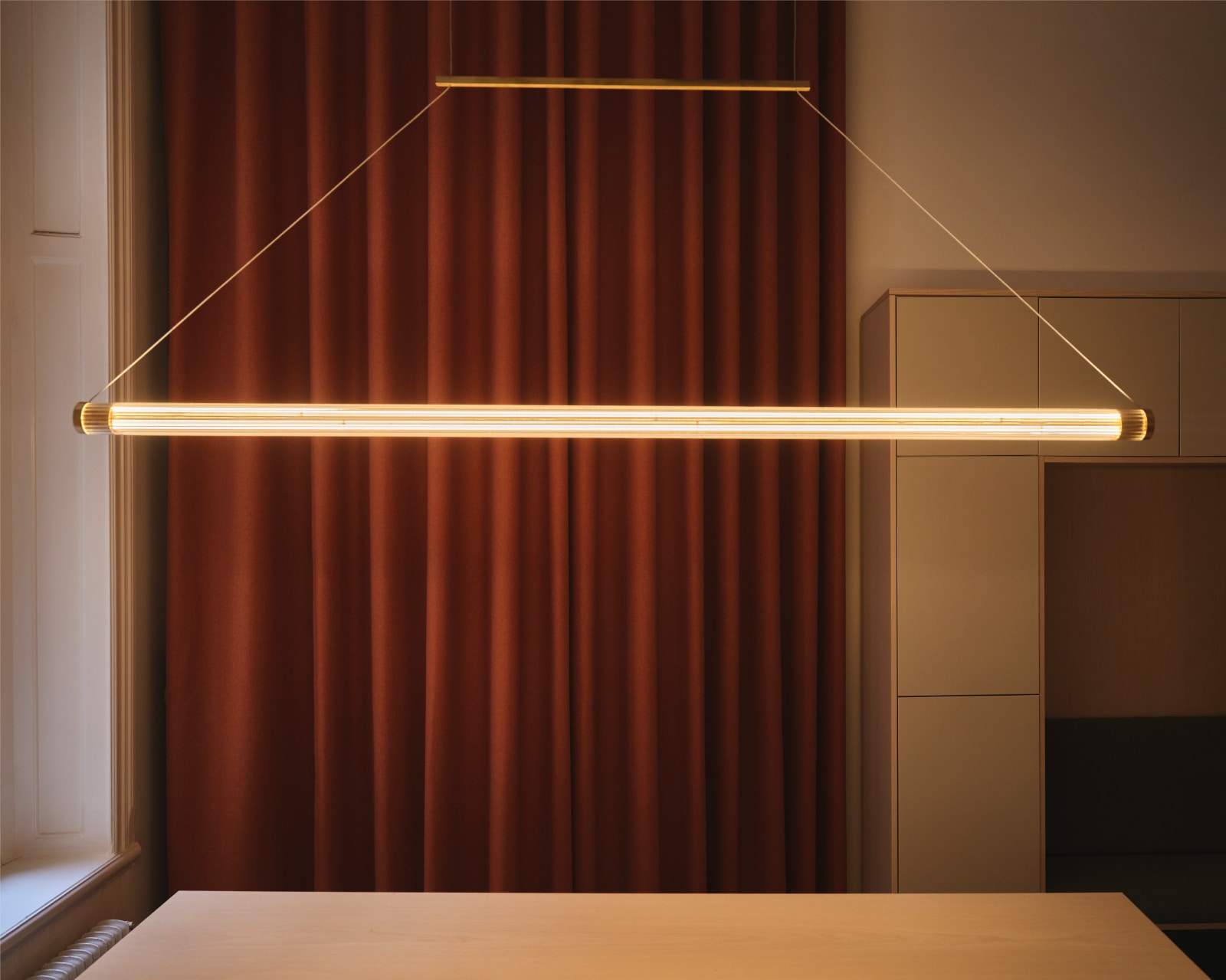 This Swedish pendant lamp with an elegant, grooved glass tube and exquisite brass details (design: Pierre Sindre) is extremely versatile thanks to its timeless, minimalist shape and delicate steel cable suspension.