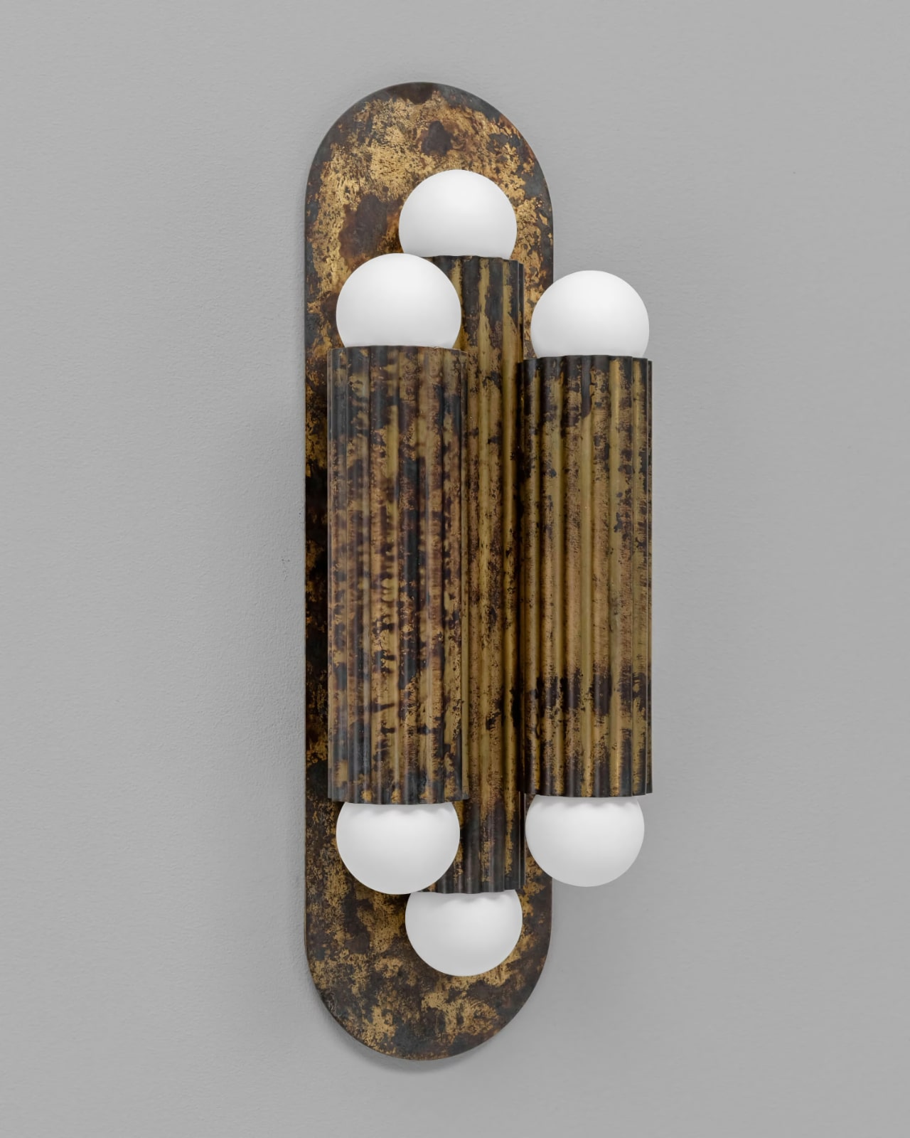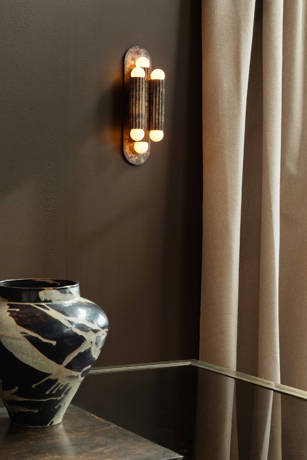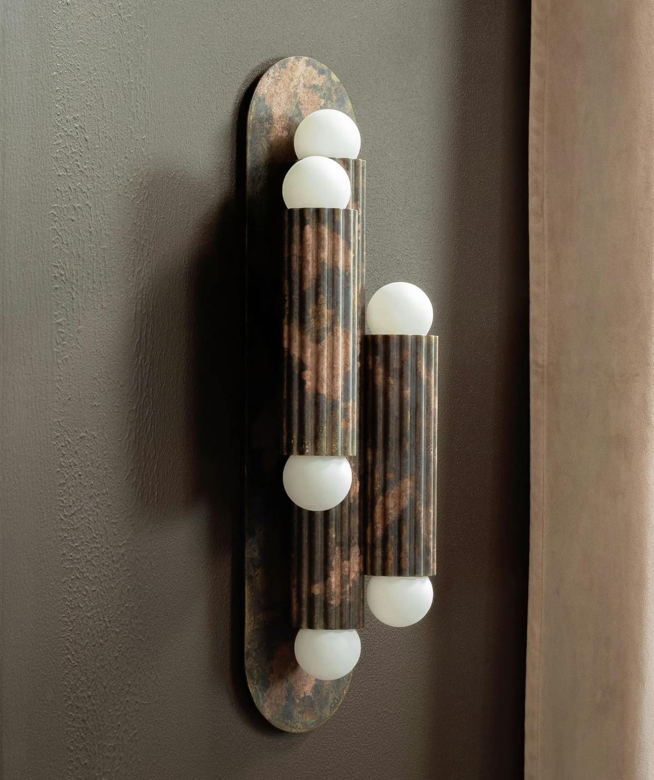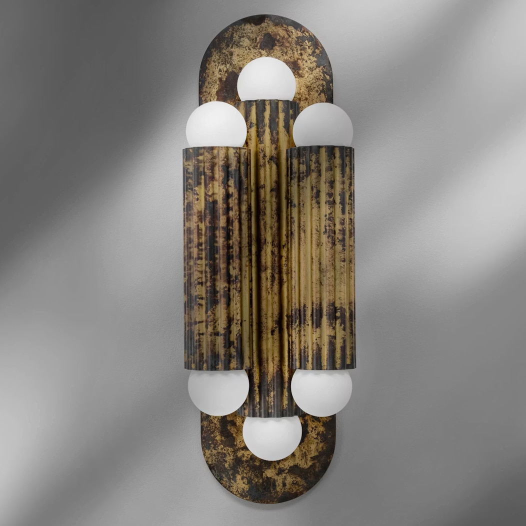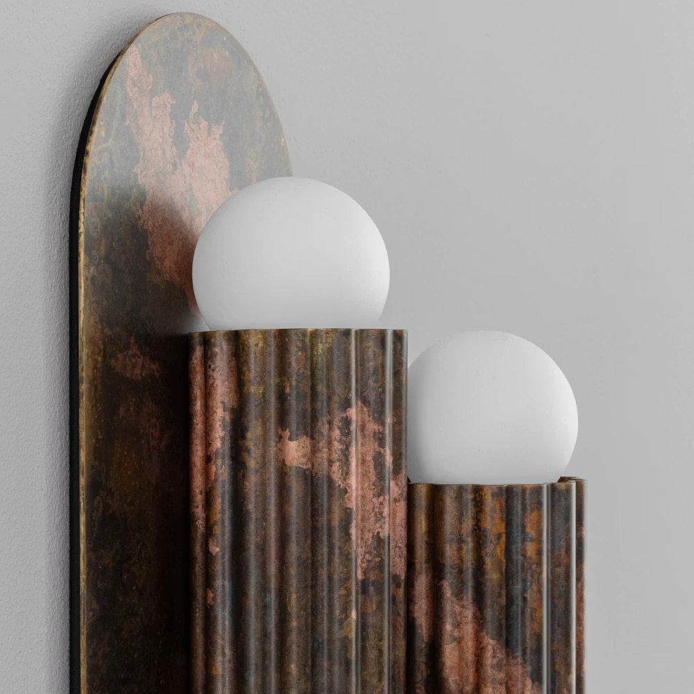 This wall light from Schwung Home features three classic "columns" reminiscent of antiquity, made of solid brass and resting on a particularly flat, discreet wall plate.
