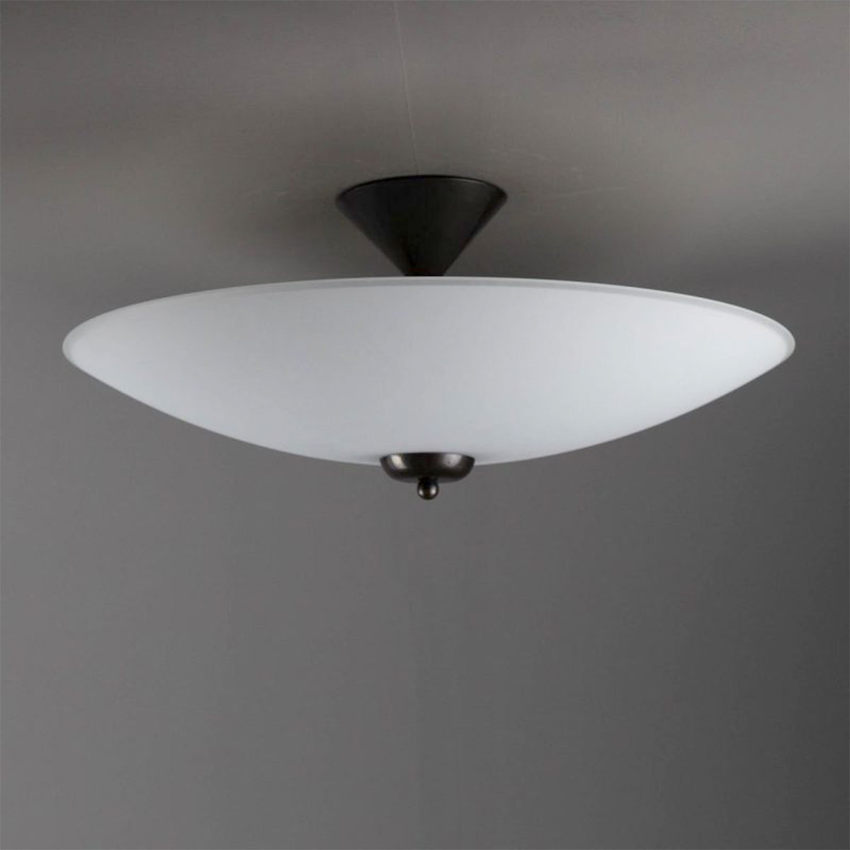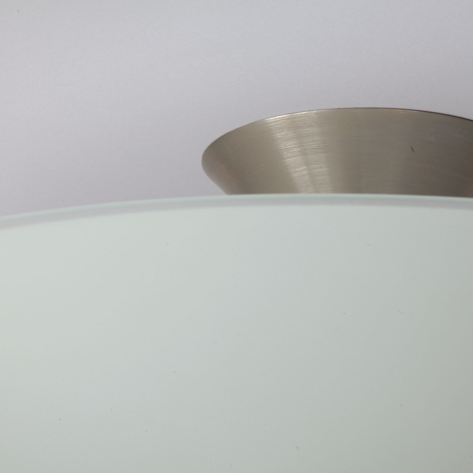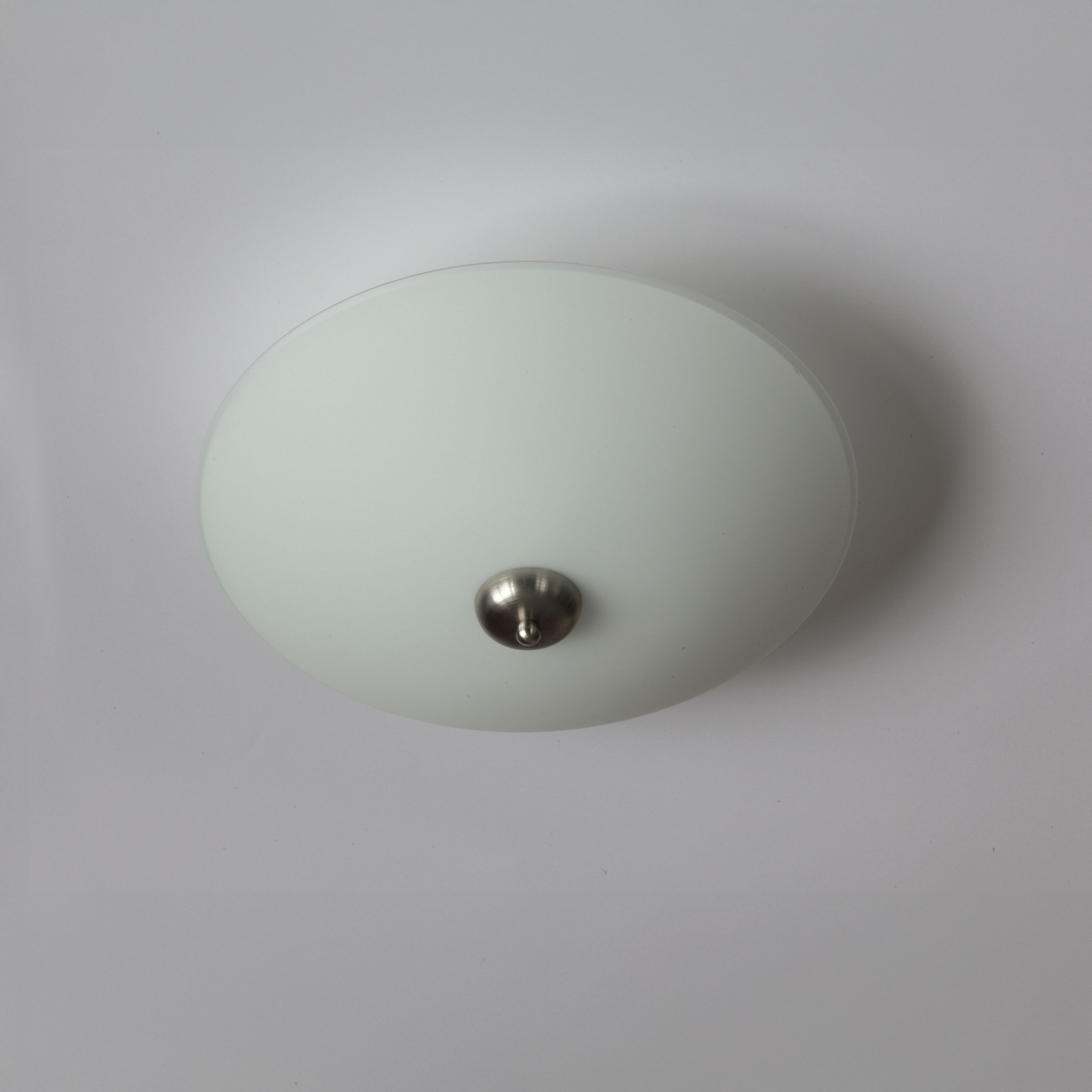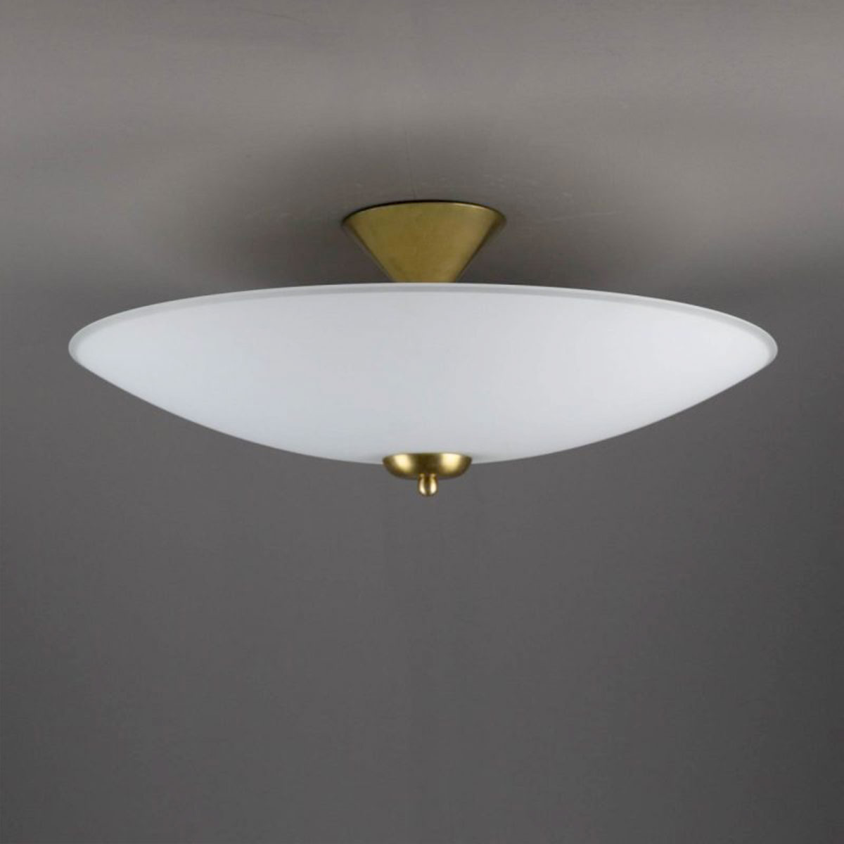This ceiling light consists of a flat, white opal glass shade with a diameter of 41 cm or 50 cm, which acts as a diffuser for two E14 sockets. It is mounted to the ceiling using an elegant brass bracket.